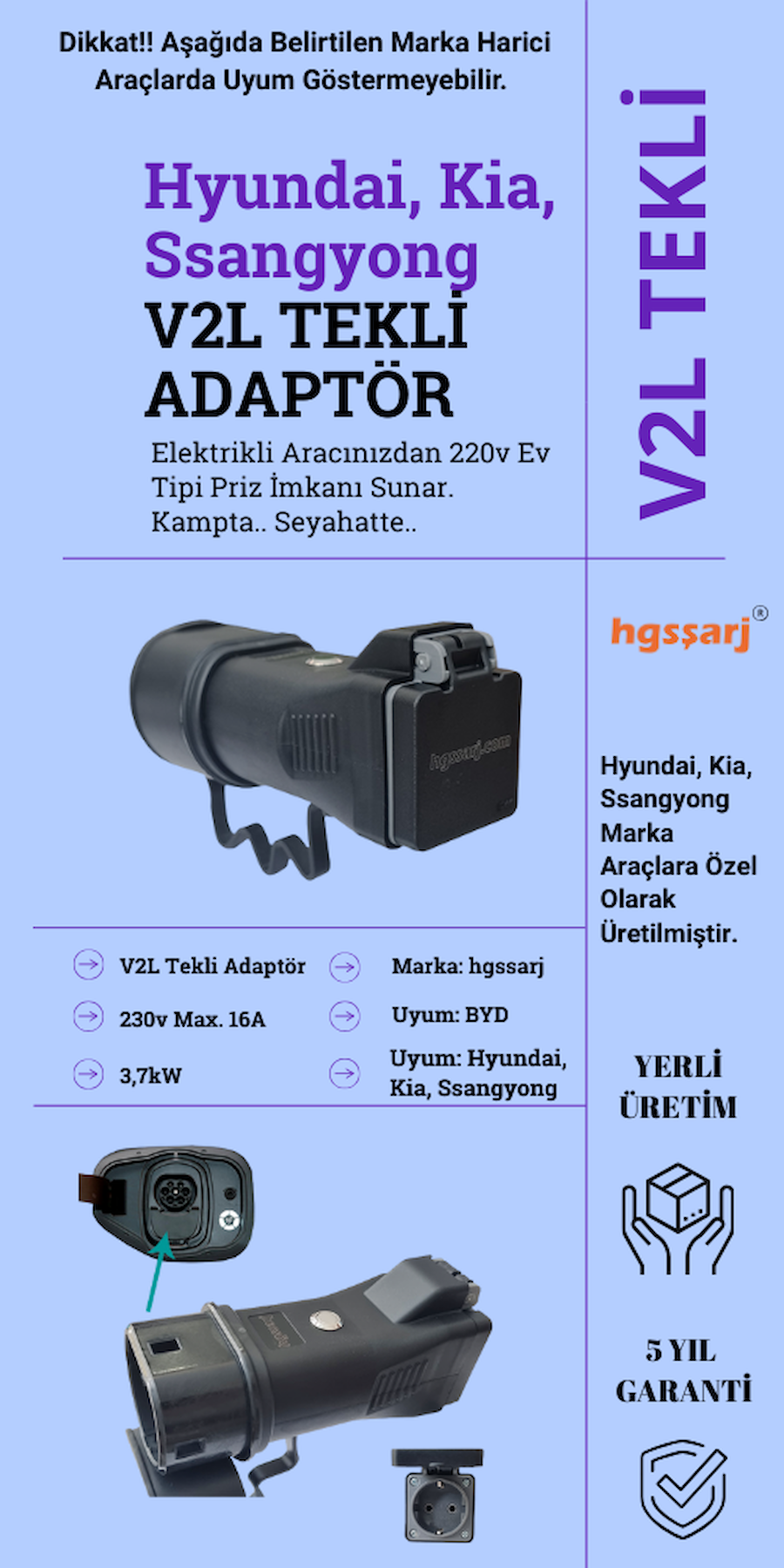 Hgsşarj V2L Adaptör Tekli, Hyundai, Kia, Ssangyong, Elektrikli Aracınıza 220V Ev Tipi Priz İmkanı