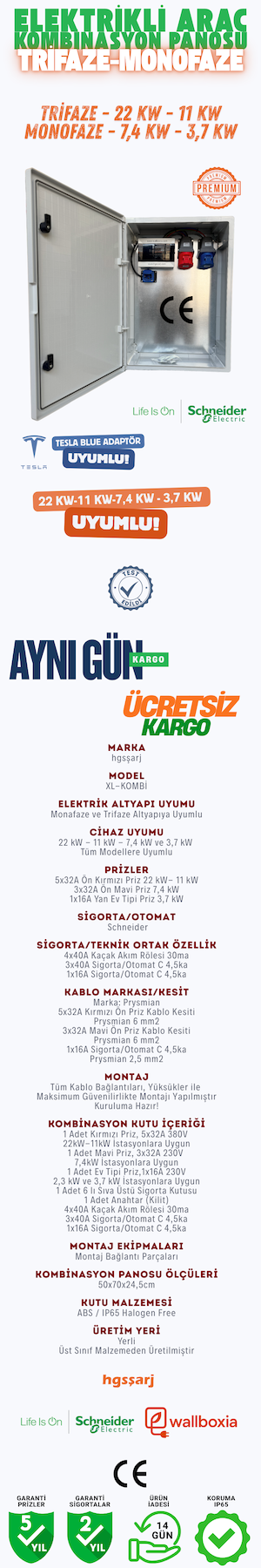 Hgsşarj "xlkombi" 5X32A + 3X32A + 1X16A 22KW Trifaze 7kw Monofaze Elektrikli Araç Kombinasyon Panosu Tesla Blue Adaptör Uyumlu Schneider Sigorta Grubu Kombinasyon Kutusu