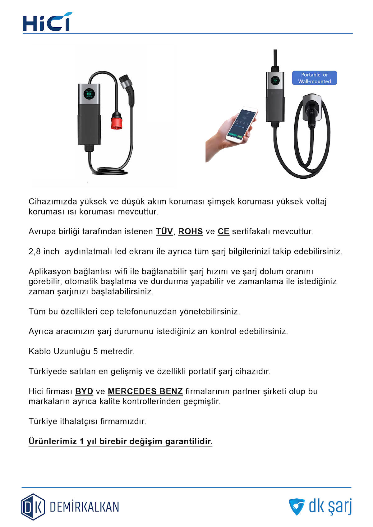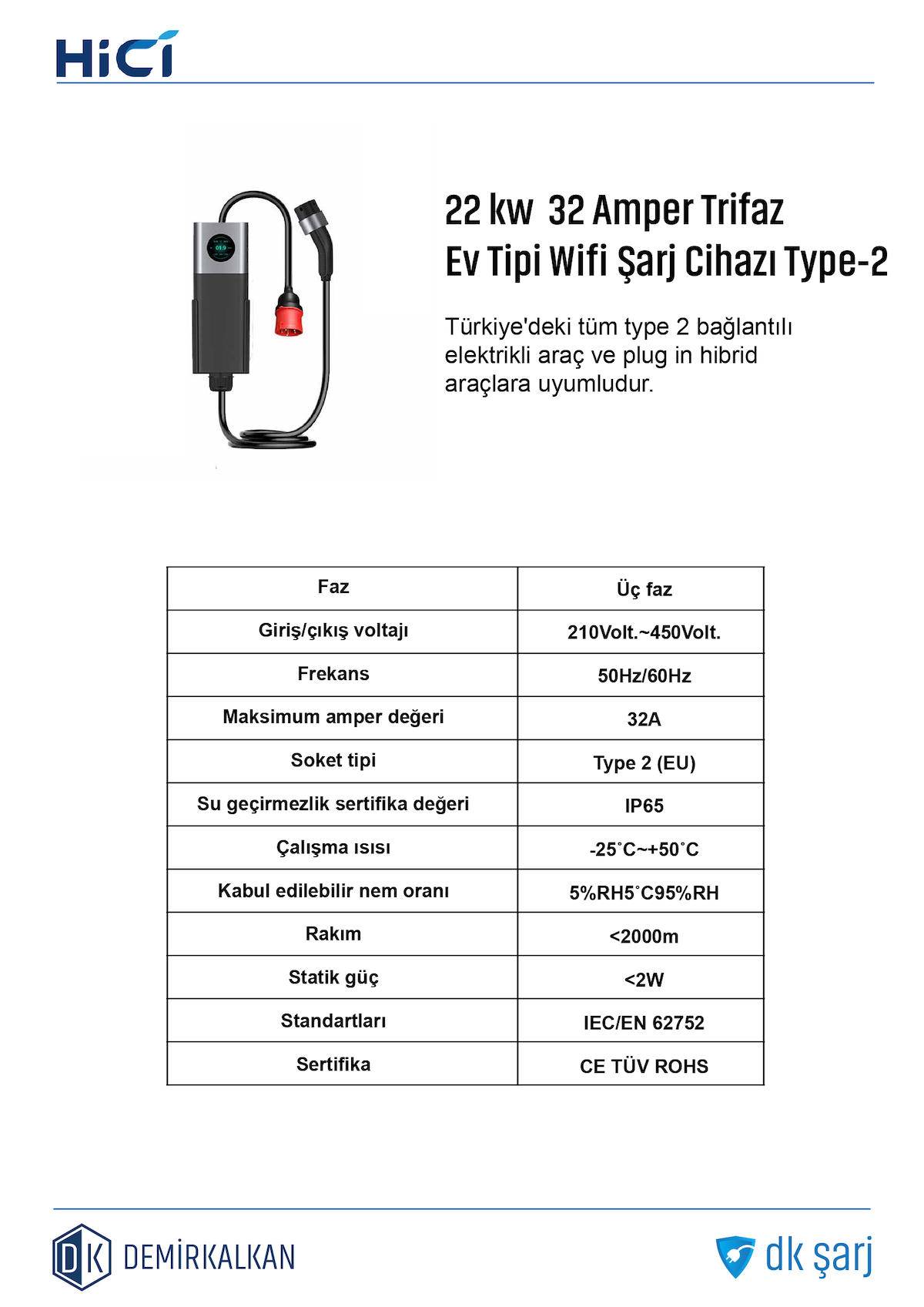 Hıcı Elektrikli Araç Şarj Istasyonu Wifi Aplikasyonlu Type2 22KW 32Amper Dönüştürücü ve Çanta Hediyeli