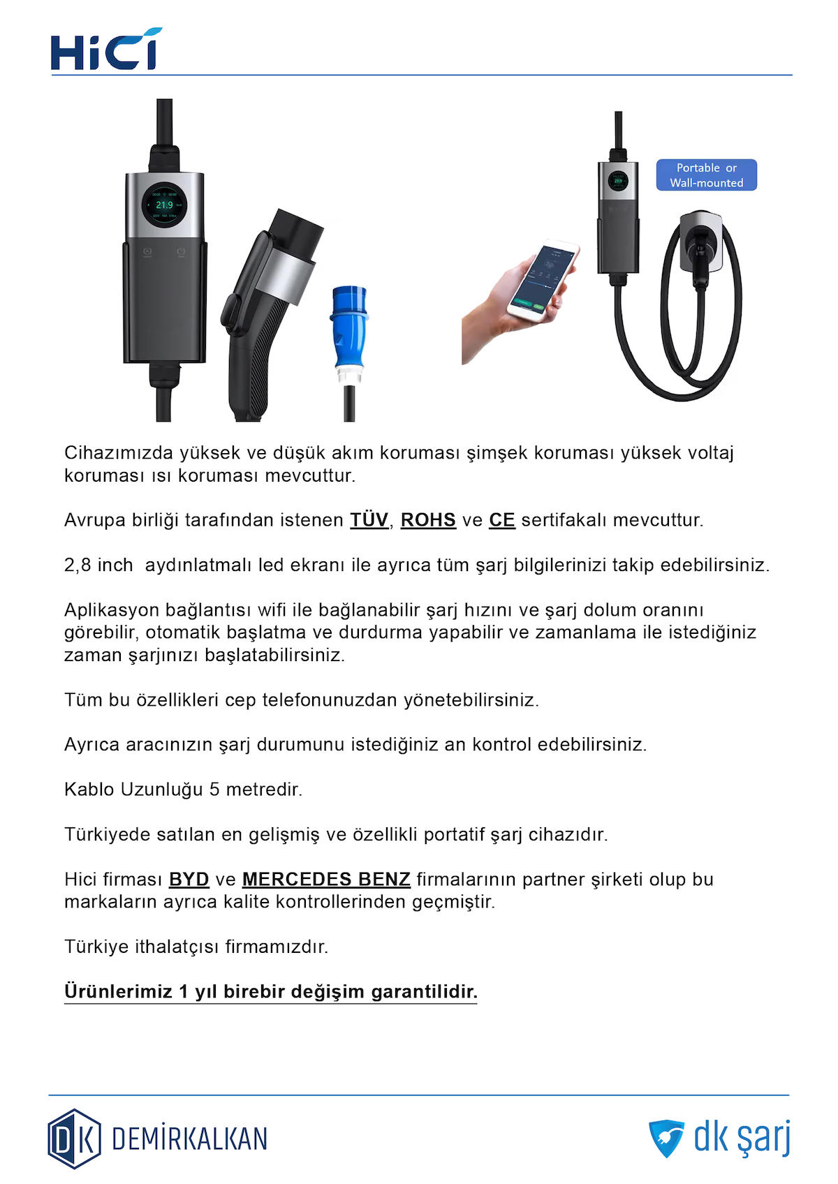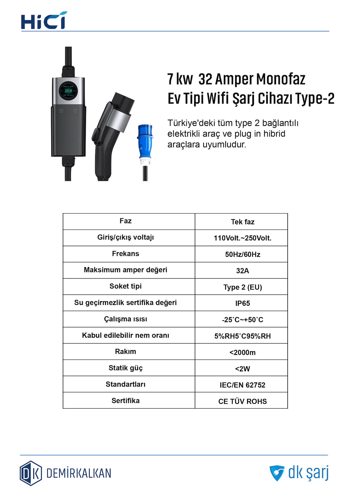 Hıcı Elektrikli Araç Şarj İstasyonu Wifi Aplikasyonu Type2 7KW 32Amper Çanta Hediyeli