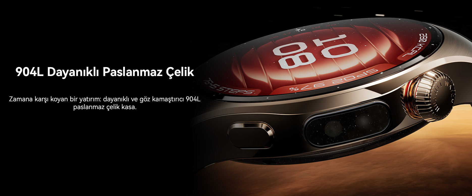 5. HUAWEI Watch5 42 mm'nin yalnızca Kum Altın ve Bej sürümleri 904L paslanmaz çelik kasa ile birlikte gelir.