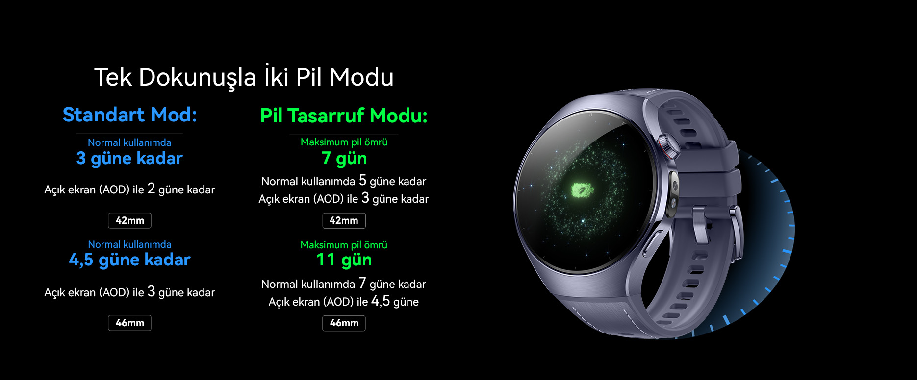 7. Veriler, Huawei laboratuvarlarından alınmıştır. Gerçek kullanım, bireysel ürün, kullanım alışkanlıkları, koşullar ve çevresel faktörlere bağlı olarak değişiklik gösterebilir. HUAWEI Watch5 46 mm (Enerji tasarrufu modunda): Pil, tipik kullanımda 7 güne kadar, AOD açıkken ise 4,5 güne kadar dayanabilir. Enerji tasarrufu modunda pil ömrü 11 güne kadar uzayabilir. HUAWEI Watch5 42 mm (Enerji tasarrufu modunda): Pil, tipik kullanımda 5 güne kadar, AOD açıkken ise 3 güne kadar dayanabilir. Enerji tasarrufu modunda pil ömrü 7 güne kadar uzayabilir. Enerji tasarrufu modunda maksimum pil ömrü, aşağıdaki koşullar altında test edilmiştir: Fabrika varsayılan ayarları kullanılmıştır, enerji tasarrufu modu etkinleştirilmiştir, haftada 30 dakika Bluetooth görüşmesi, haftada 30 dakika Bluetooth müzik çalma, kalp atış hızı izleme her zaman açık, HUAWEI TruSleep™ gece boyunca açık, haftada ortalama 90 dakika egzersiz, mesaj bildirimleri etkin (günde 50 mesaj, 6 çağrı ve 3 alarm), cihaz ekranı günde 200 kez açılmıştır. Enerji tasarrufu modunda tipik pil ömrü, aşağıdaki koşullar altında test edilmiştir: Fabrika varsayılan ayarları kullanılmıştır, enerji tasarrufu modu etkinleştirilmiştir, haftada 30 dakika Bluetooth görüşmesi, haftada 30 dakika müzik çalma, kalp atış hızı izleme her zaman açık, HUAWEI TruSleep™ gece boyunca açık, stes izleme etkin, nabız dalgası aritmisi analizi ve uyku apnesi özellikleri etkin, haftada ortalama 180 dakika egzersiz, mesaj bildirimleri etkin (günde 50 mesaj, 6 çağrı ve 3 alarm), cihaz ekranı günde toplam 30 dakika açık kalmıştır. Enerji tasarrufu modunda Always On Ekran açıkken pil ömrü, aşağıdaki koşullar altında test edilmiştir: Fabrika varsayılan ayarları kullanılmıştır, enerji tasarrufu modu etkinleştirilmiştir, Always On Ekran açık, haftada 30 dakika Bluetooth görüşmesi, haftada 30 dakika müzik çalma, kalp atış hızı izleme her zaman açık, HUAWEI TruSleep™ gece boyunca açık, stes izleme etkin, nabız dalgası aritmisi analizi ve uyku apnesi özellikleri etkin, haftada ortalama 180 dakika egzersiz, mesaj bildirimleri etkin (günde 50 mesaj, 6 çağrı ve 3 alarm), cihaz ekranı günde toplam 30 dakika açık kalmıştır.