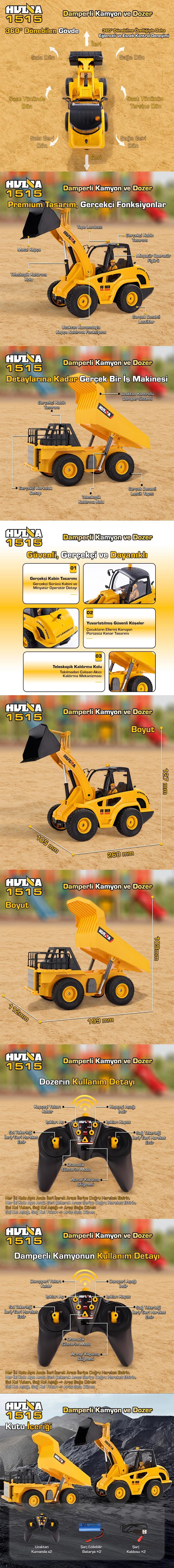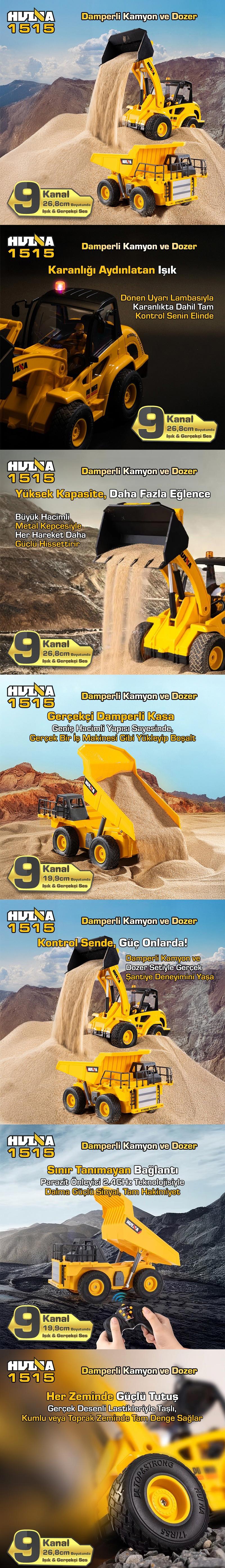 HUINA 1515 1/24 9CH RC Damperli Kamyon & Wheel Loader Dozer Kazıcı Set İş Makinesi İnşaat Uzaktan Kumandalı RC Model Metal Kepçeli - 2.4G Gerçekçi Similasyon Ses ve Işık Sistemi