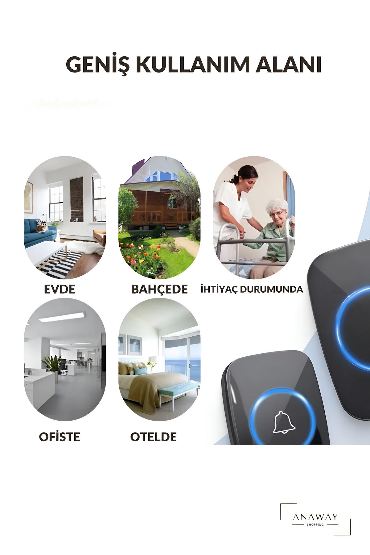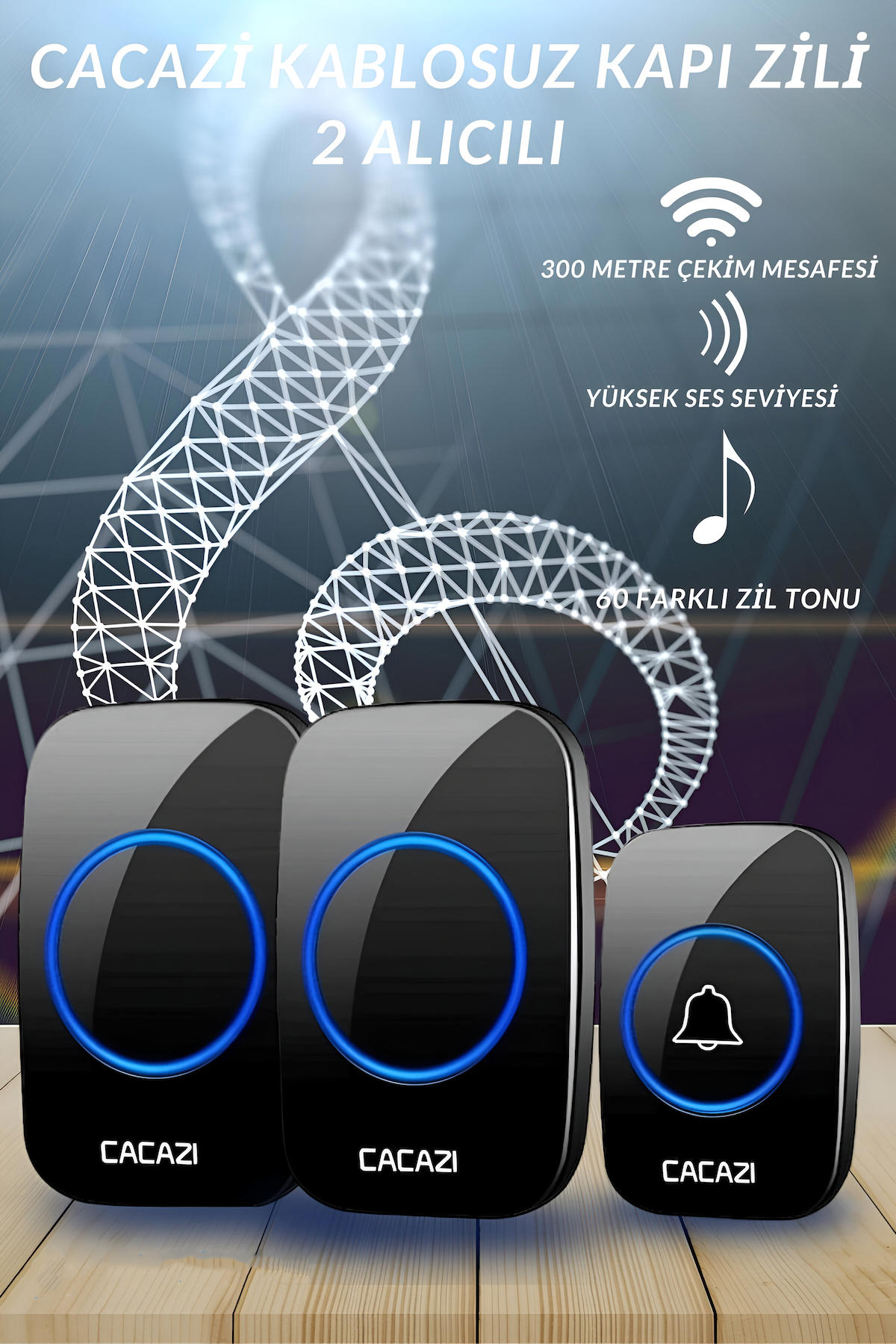 Cacazi 2 Alıcılı Kablosuz Uzaktan Kumandalı LED Kapı Zili 1 Verici 2 Alıcı Olan Model