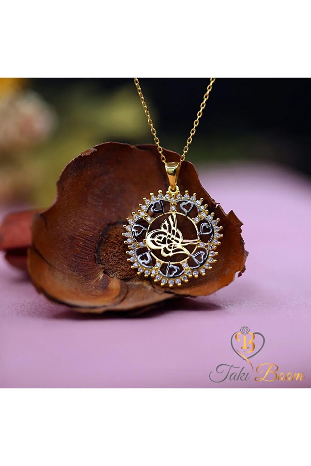 Kadın Altın Beyaz Taşlı Kalpli Tuğra 925 Ayar Gümüş Kolye