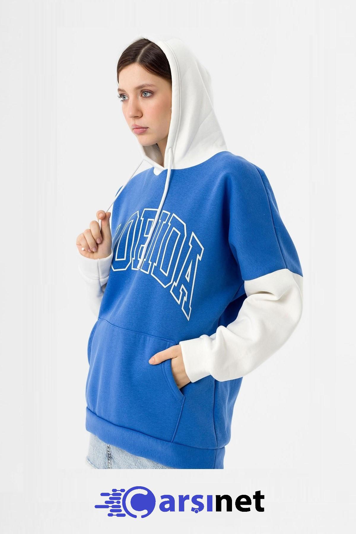 Kadın Mavi Sweatshirt Kolu Garnili Yazı Baskılı Sweat: Rahat ve Şık