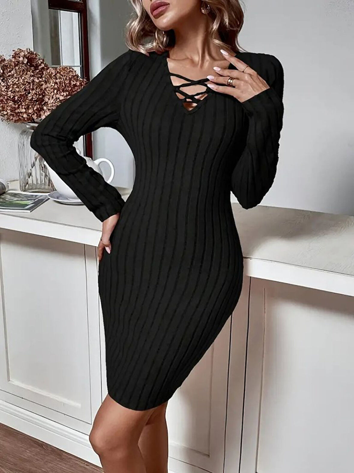 Kadın Uzun Kollu V Yakalı çapraz şerit Detaylı şardonlu Kaşkorse Midi Elbise