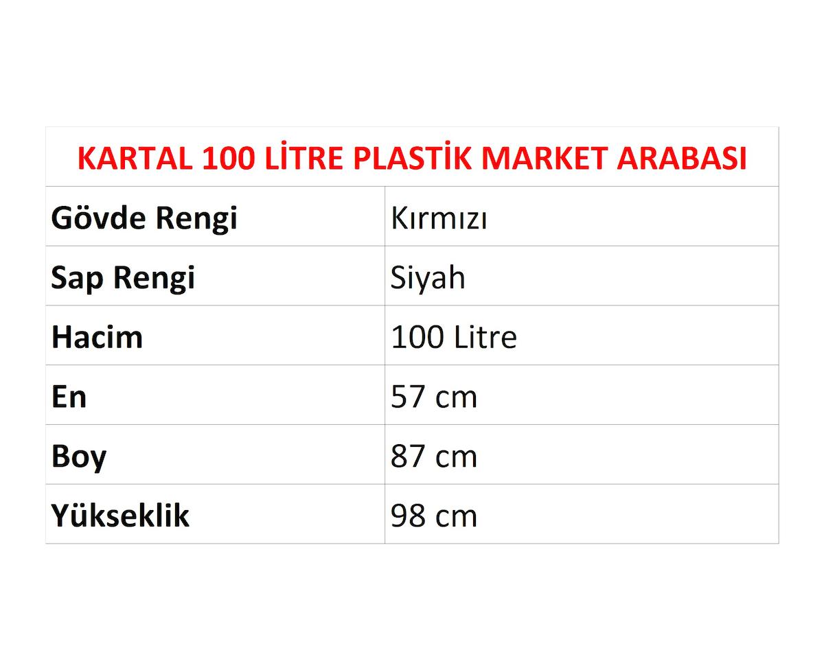 Kartal plastik market arabaları 100, 130 ve 150 litre olarak üretilmektedir. Standart olarak kırmızı, turuncu, yeşil ve mavi renklerde sunulan kartal plastik market arabası, özel istek doğrultusunda farklı renk ve ölçülerde üretilebilmektedir. Kartal plastik market arabasının sap kısımlarını özel istek doğrultusunda firma mağaza logonuz ile baskılı alma seçeneği de bulunmaktadır.