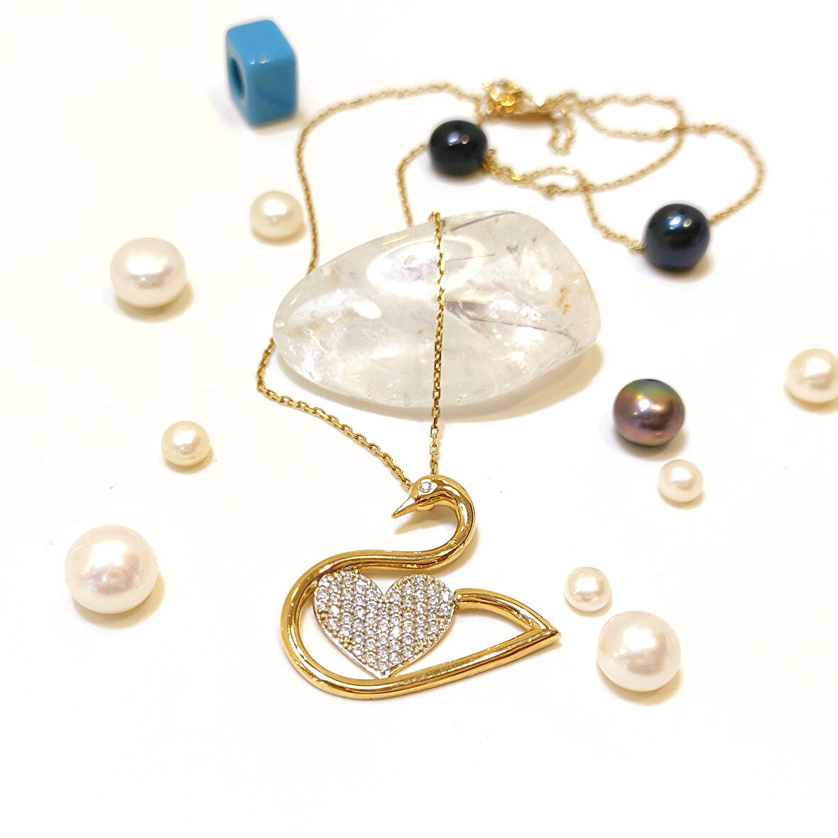 Kuğu Kalp Kolye 14 Ayar Altın HD VİDEOLU
