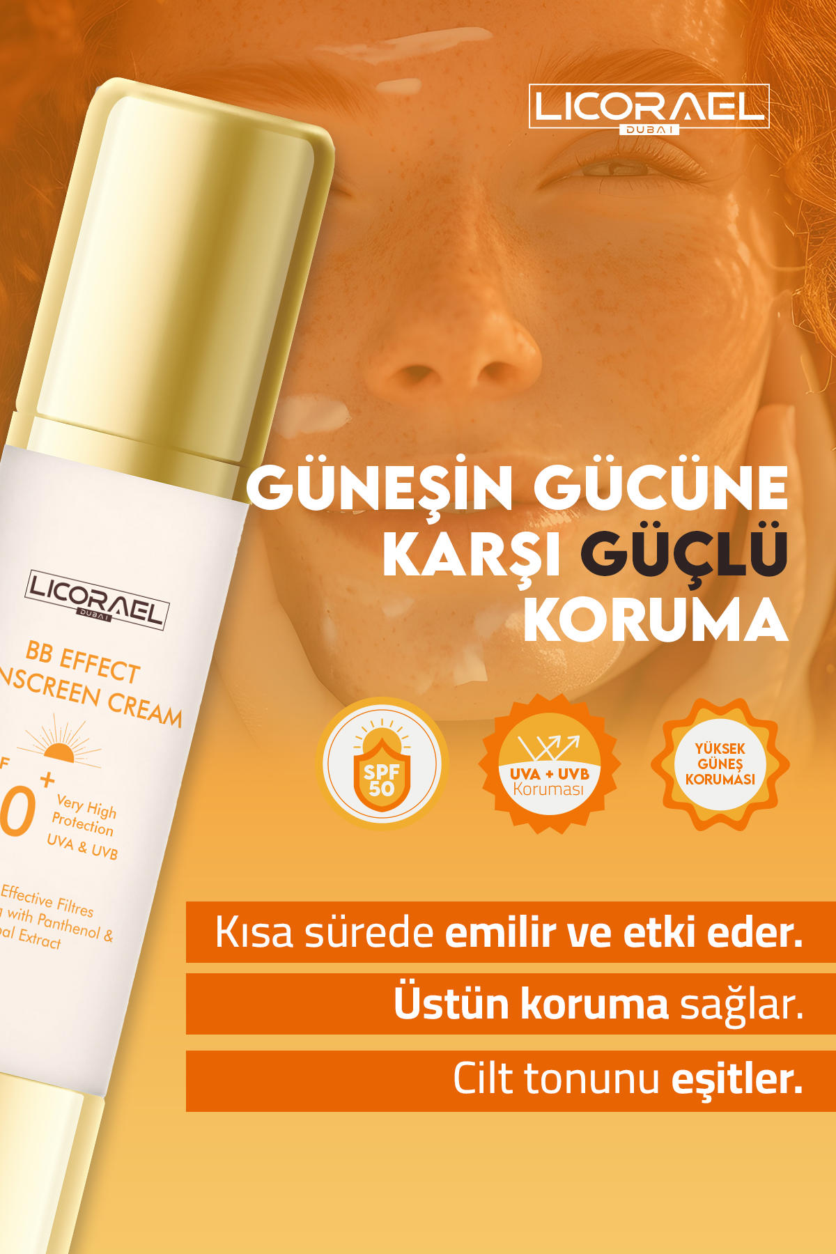 TR- Kapatıcı özellikli renkli güneş koruyucu krem, UVA ve UVB ışınlarına karşı yüksek koruma sağlarken cildi aydınlatmaya yardımcı olur.