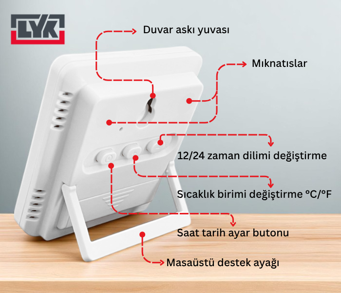 - LCD ekrandaki sıcaklık ve nem göstergesinin yazı yüksekliği 2.5 cm, saat ve tarih göstergesinin yazı yüksekliği ise 1 cm’dir; böylece veriler net ve kolay okunabilir.