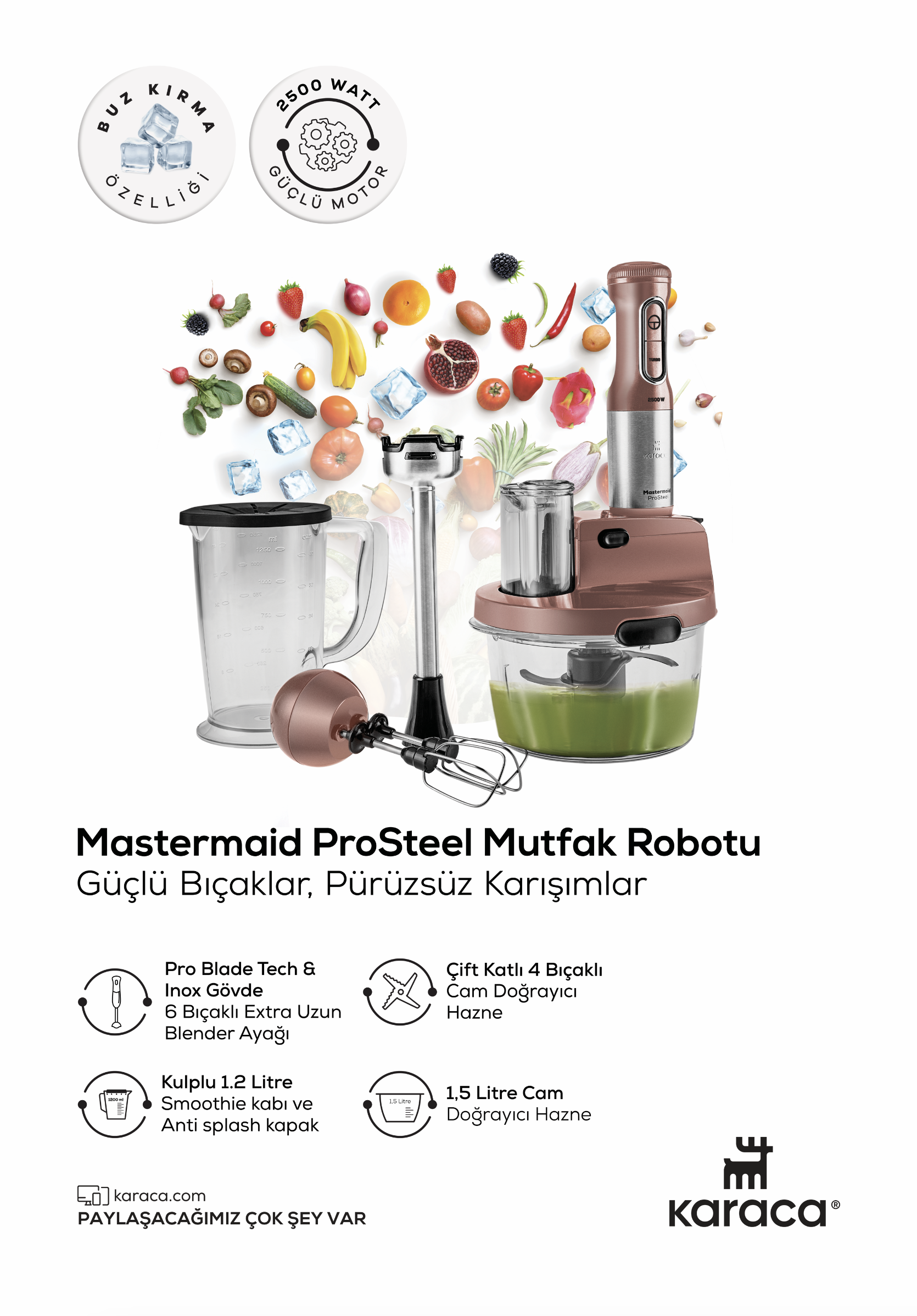 2500 Watt güçlü motoru ve turbo fonksiyonu ile lezzetli gıdaları en hızlı şekilde hazırlayabilir, zamandan tasarruf edebilirsiniz.