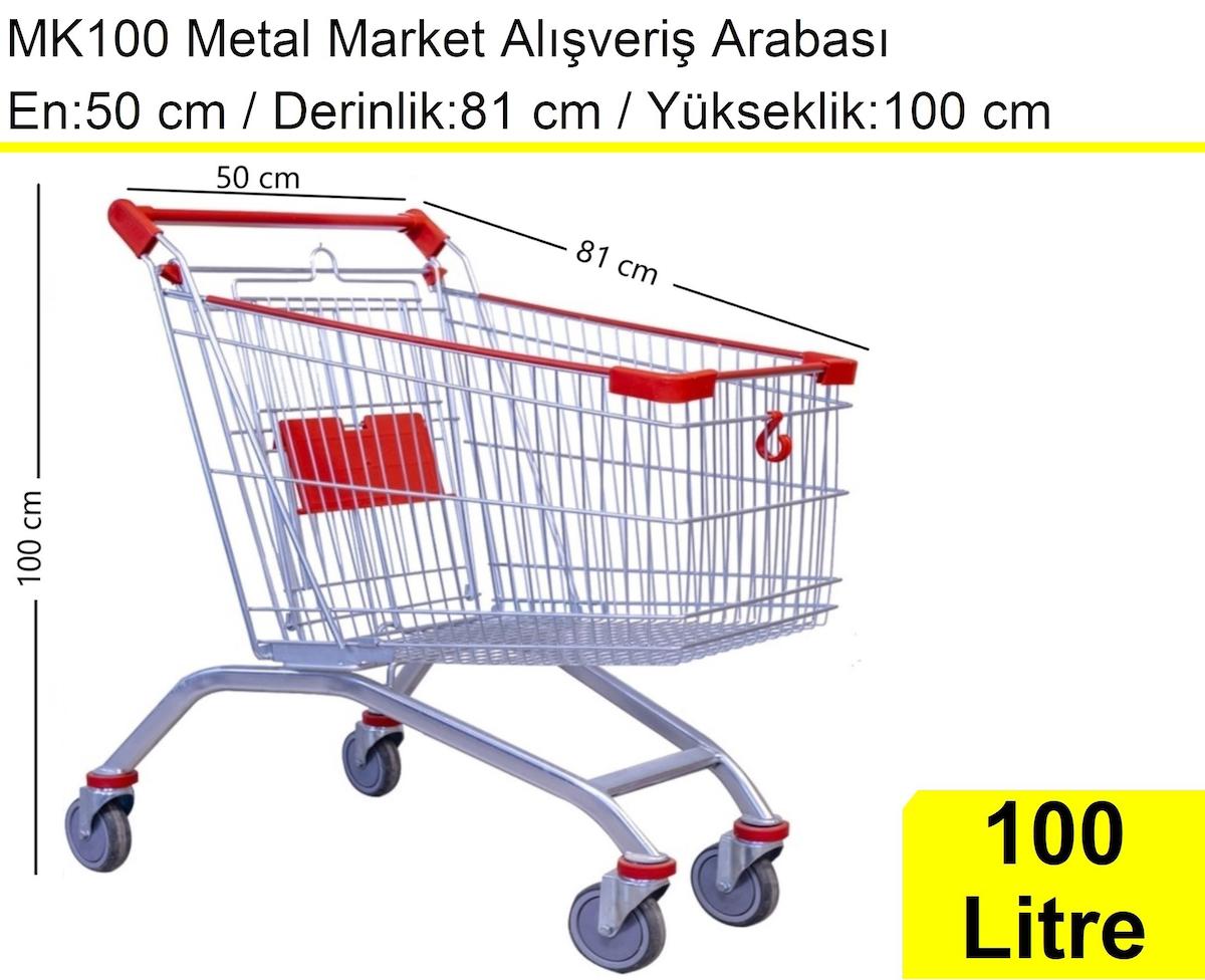 100 Lt, 125 Lt, 150 Lt, 180 Lt, ve 210 Litre seçenekleri ile perakende sektörüne sunulan MK100 metal market arabası, galvaniz kaplama yapılarak perakende sektöründe birçok firma tarafından tercih edilmektedir. MK100 market arabasında yer alan plastik malzeme, Polietilendir. Güçlü yüzey kaplaması ve dayanıklı yapısıyla MK100 market arabaları, süpermarket, hipermarket, şarküteri gibi müşteri sirkülasyonunun hızlı olduğu yerlerde özellikle tercih edilmektedir.