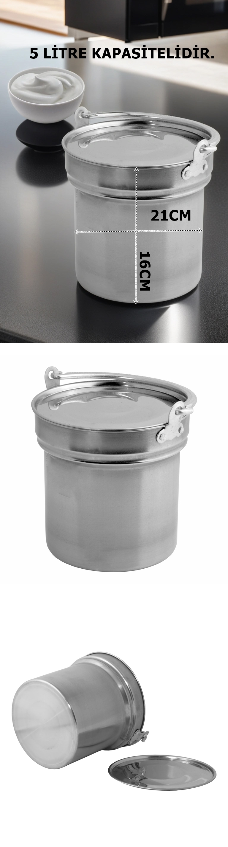 Avantajları: 5 litre geniş hacim: Aile boyu yoğurt üretimi için ideal Paslanmaz çelik gövde: Koku yapmaz, leke tutmaz, uzun ömürlü Kilitli kapak: Mayalama sırasında ısıyı korur, taşıma sırasında dökülmeyi önler Isıya dayanıklı: Sıcak sütle temasa uygundur Kolay temizlenebilir: Bulaşık makinesine uygun Geleneksel bakraç formu: Estetik ve nostaljik görünüm