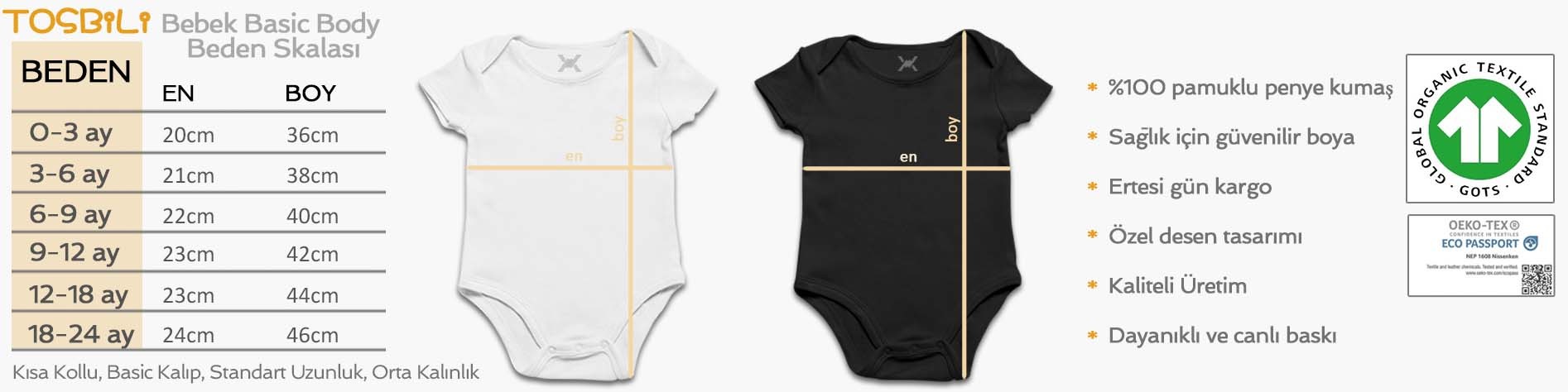 * Baskılarımız Oeko-tex sertifikasına sahip olup, insan sağlığına zararsızdır. Ayrıca baskılarımız, Türkiye’de tek organik kumaş ve bebek ürünleri üzerine baskı yapabilme sertifikası olan GOTS sertifikasına da sahip olup, bebeklerde bile güvenle kullanım imkanı sunmaktadır.