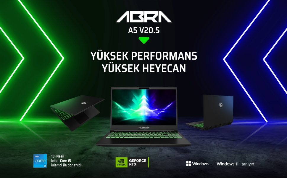 Monster Abra A5 V20.5.5 Intel Core i5 13420H 32 GB RAM 1 TB SSD 4 GB RTX 3050 Windows 11 15,6" FHD 144 Hz Oyun Bilgisayarı