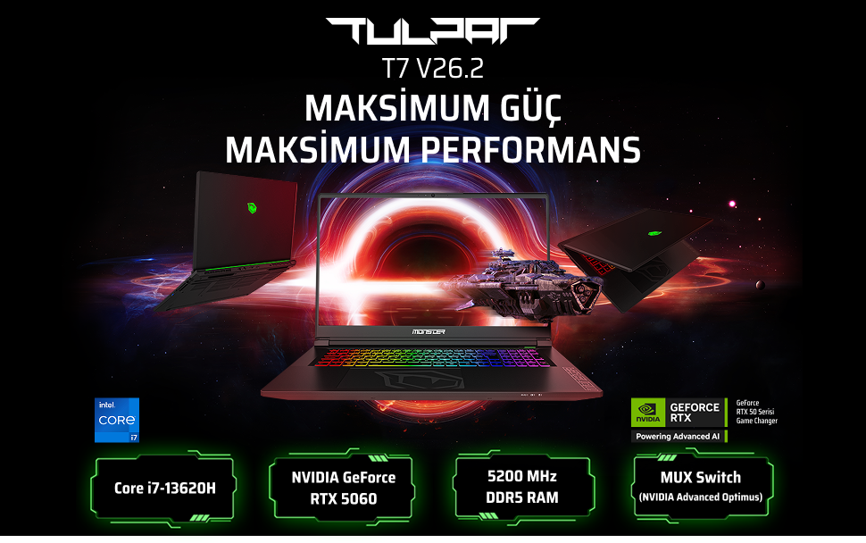 Monster Tulpar T7 V26.2 Intel Core i7 13620H 16 GB RAM 500 GB SSD 8 GB RTX 5060 Freedos 17,3" FHD 144 Hz Oyun Bilgisayarı