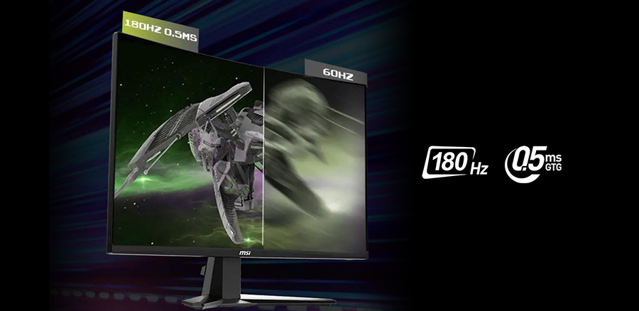 MSI Gaming monitörler, nişancı oyunları, dövüşçüler, yarış simülasyonları, gerçek zamanlı strateji ve spor gibi hızlı hareket eden oyun türlerinde en fazla fayda sağlayan 180 Hz yenileme hızı + 0.5 ms tepki süresi Rapid IPS panel ile donatılmıştır. Bu tür oyunlar çok hızlı ve hassas hareketler gerektirir, bu da ultra yüksek yenileme hızı ve hızlı tepki süresine sahip bir monitörün sizi rakiplerinizin önüne geçirmesini sağlar.