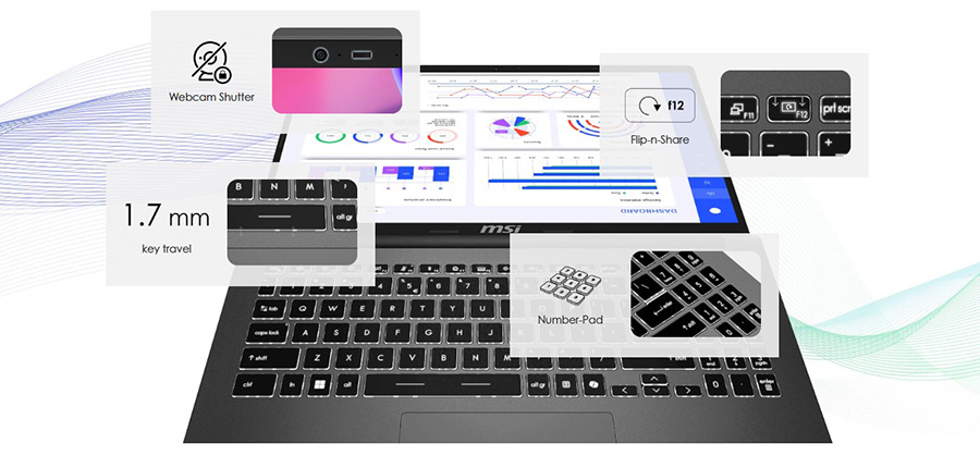 Modern 15, farklı ihtiyaçlarınıza ve kullanım senaryolarına hareket halindeyken bile cevap vermek için üretildi. Yenilenen ve daha da genişletilen dokunmatik yüzeyi, tam geriden aydınlatmalı klavyesi, 1.7mm tuş hareket mesafesi ve Flip-n-Share işlevi için 180° yatabilen ekranına ek olarak ekstra güvenlik için kameranıza bir Webcam kapağı da eklendi.