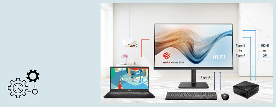 * Productivity Intelligence APP (P.I.) yazılımının son sürümünü destek sayfasından indirebilirsinizProductivity Intelligence App uygulamasından en iyi şekilde yararlanmak için birinci bilgisayarınızı USB Type B ~ A portu ile Modern MD272 monitörünüze bağlayın, ardından görüntüyü HDMI veya DP portu üzerinden aktarın.
