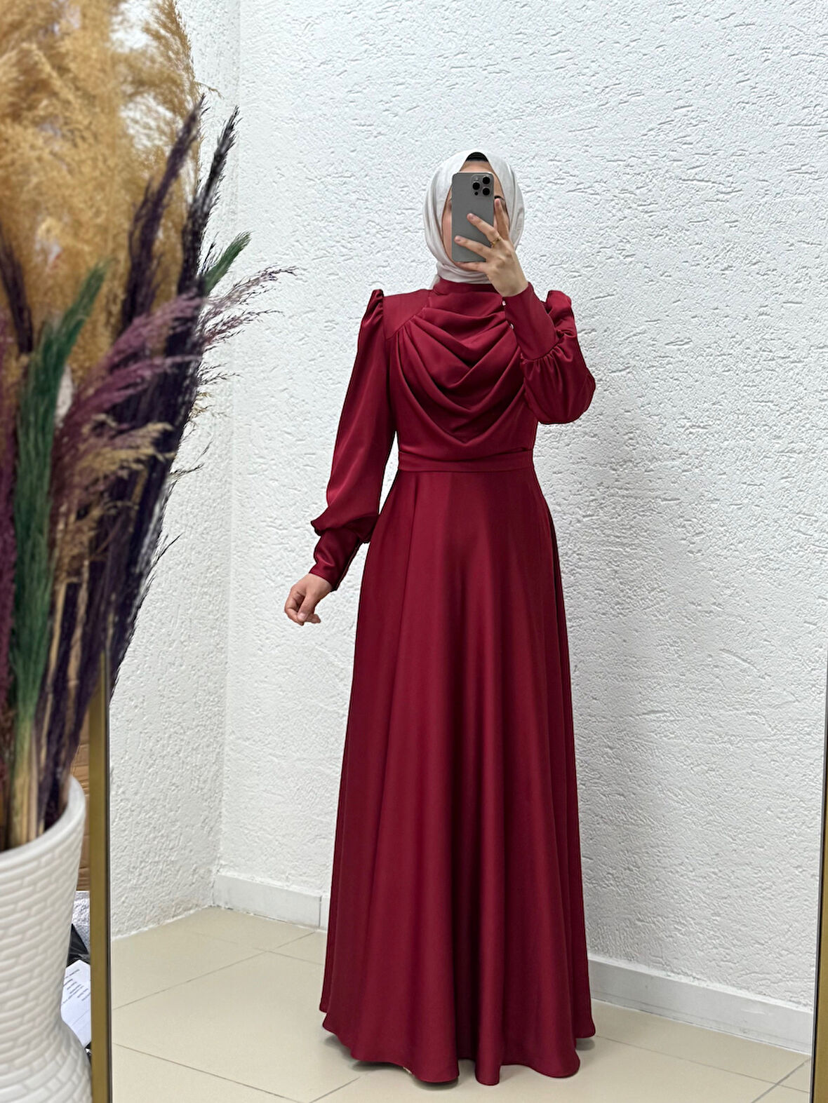 Orelenya Önü Büzgülü Saten Abiye-GE8112 Kırmızı