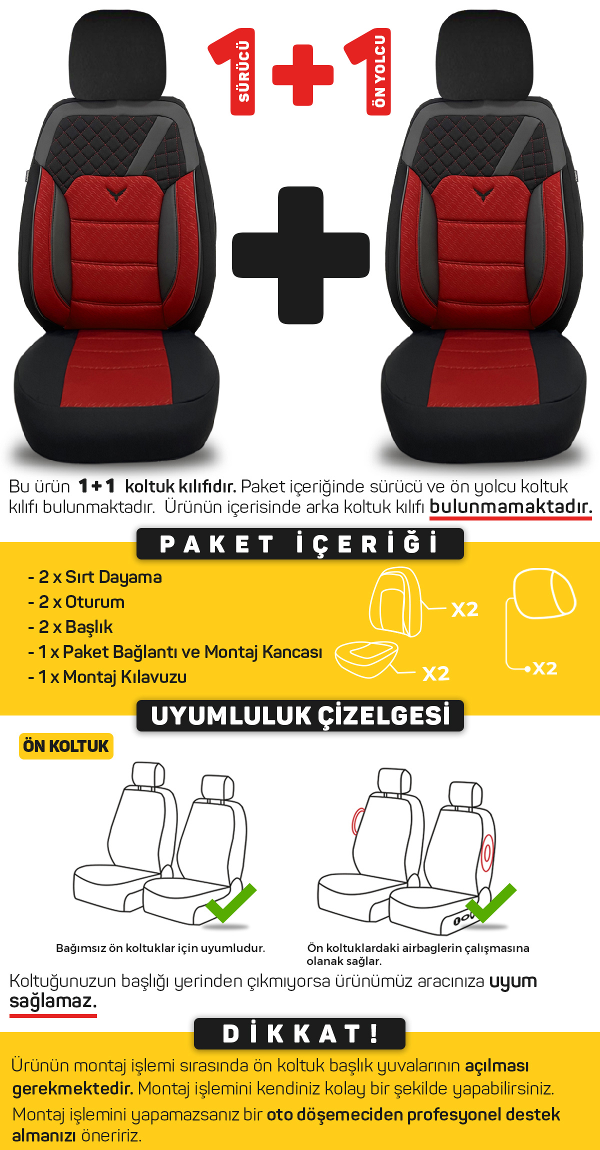 Pandami K1 Serisi Oto Koltuk Kılıfı 1+1 Set, Gofraj / Kırmızı, Opel Astra 1998 ile Uyumlu