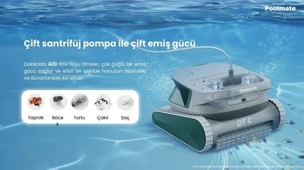 Poolmate DTC, gelişmiş motor gücüyle havuz tabanındaki tüm kirleri, yosunları ve partikülleri güçlü şekilde emer.
