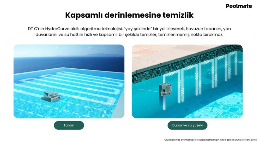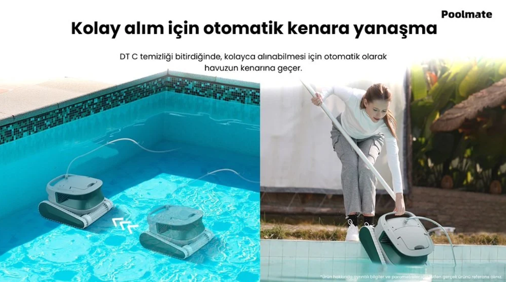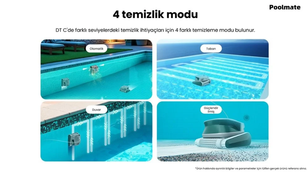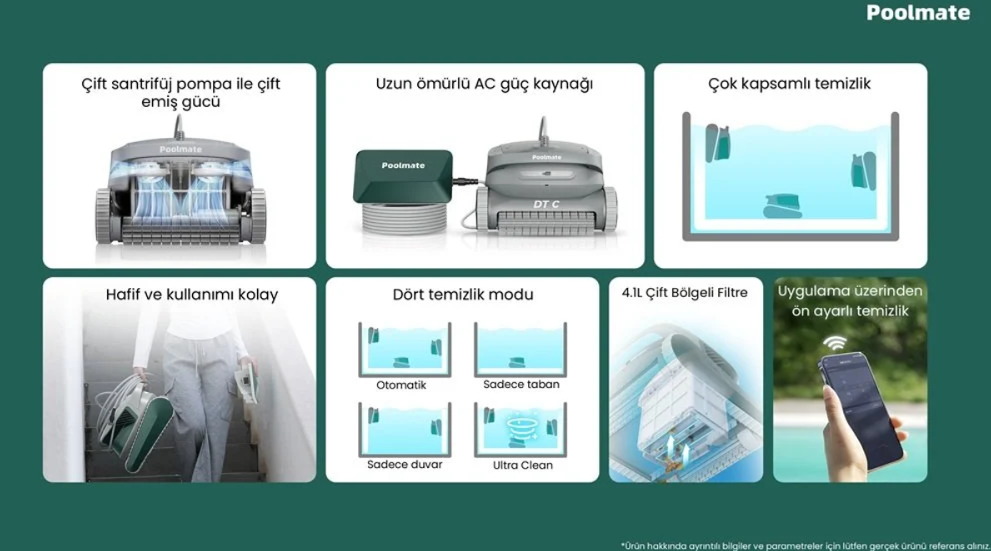 Poolmate DTC modeli, 10 x 4 metreye kadar olan yüzme havuzlarında güçlü ve kapsamlı temizlik sağlayan akıllı havuz robotudur.