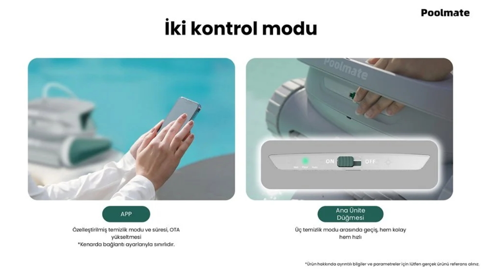 Tüm bu modlar hem manuel kontrolle hem de robot su dışında iken uygulama üzerinden programlanabilir.