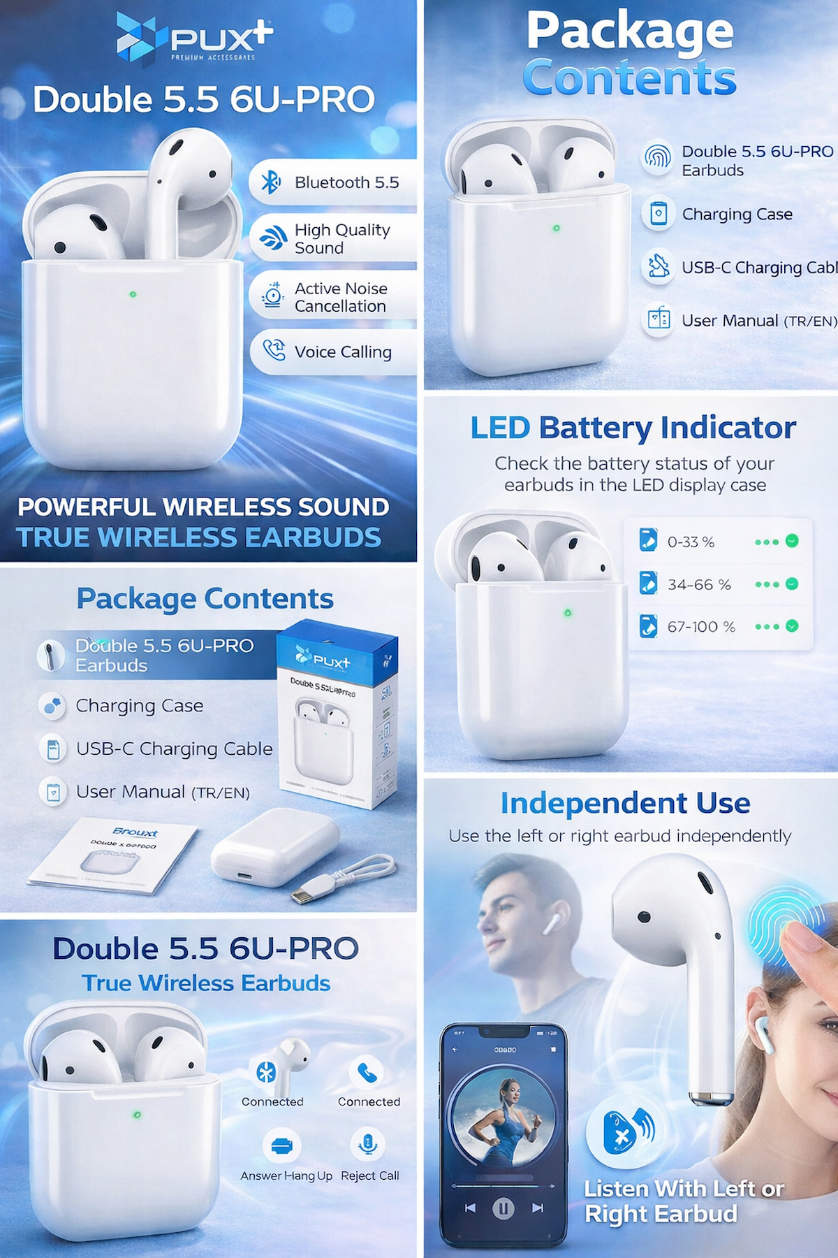 PUX TWS Kablosuz Bluetooth Kulaklık, gelişmiş Bluetooth5.2 teknolojisi, üstün ses performansı, hızlı bağlantıve ergonomik tasarımıyla günlük kullanımda maksimum konforsunar. Dokunmatik kontrol paneli ile çağrılarınızı yönetebilir,müziklerinizi kontrol edebilir ve tek dokunuşla tüm fonksiyonlaraerişebilirsiniz. Hem iOS hem de Android cihazlarla sorunsuzuyumludur.