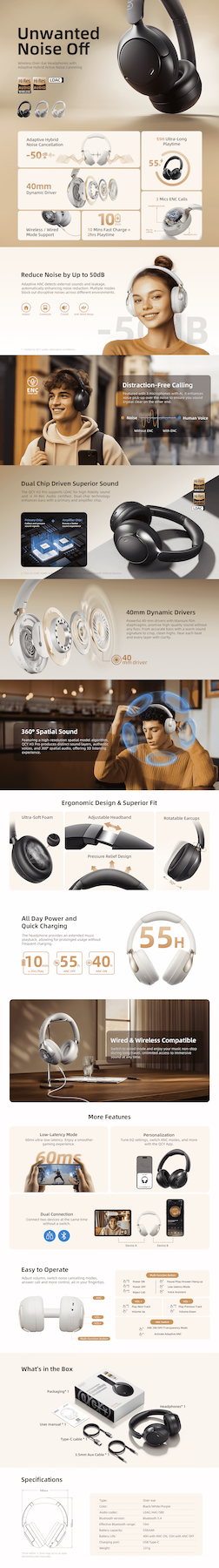 Uyarlanabilir gürültü önleme, harici sesleri ve ses sızıntısını algılar, optimum gürültü azaltma ve EQ ayarlarını otomatik olarak uygular. Farklı modlar, çeşitli ortamlarda en rahatsız edici sesleri engellemek için tasarlanmıştır.