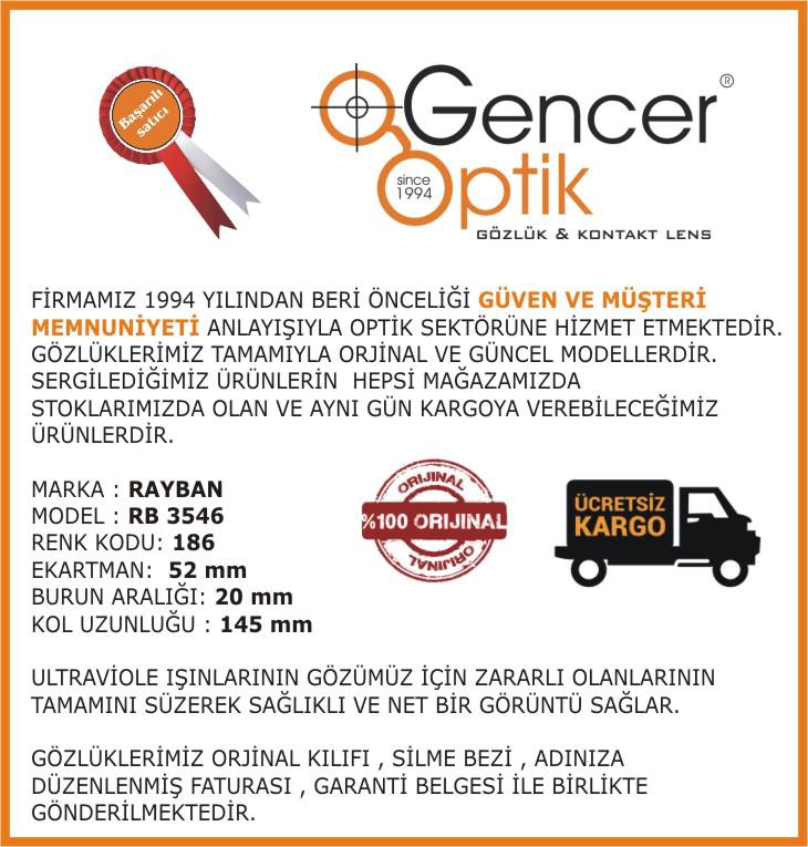 RAYBAN RB 3546 186 UNİSEX GÜNEŞ GÖZLÜĞÜ Orjinal,Garantili,Aynı gün ücretsiz kargo