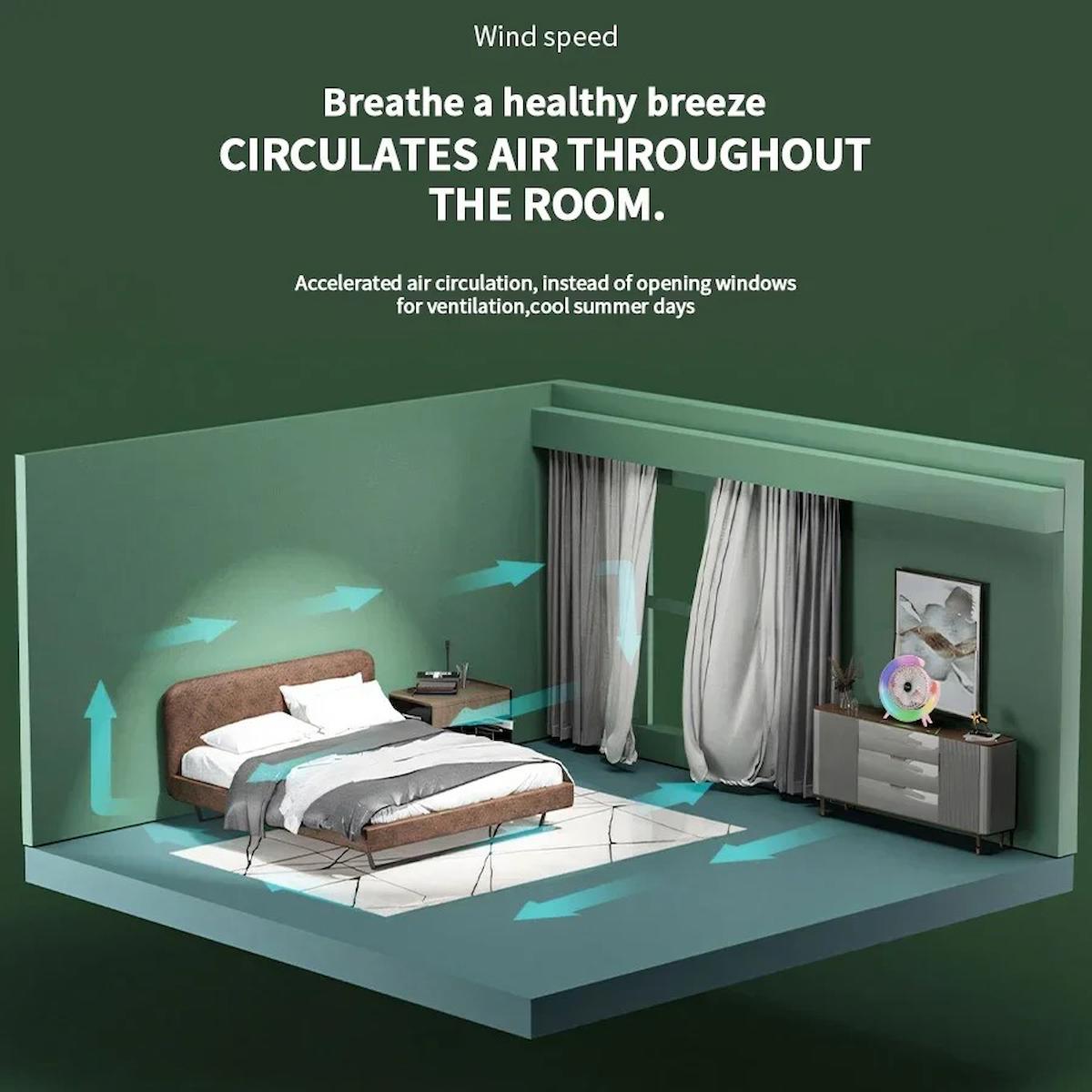 Modern ve şık tasarımıyla dikkat çeken bu taşınabilir mini fan, 3 kademeli hız ayarı sayesinde istediğiniz serinliği sunar. 7 farklı RGB ışık modu ile hem gece lambası hem de dekoratif aydınlatma olarak kullanılabilir.