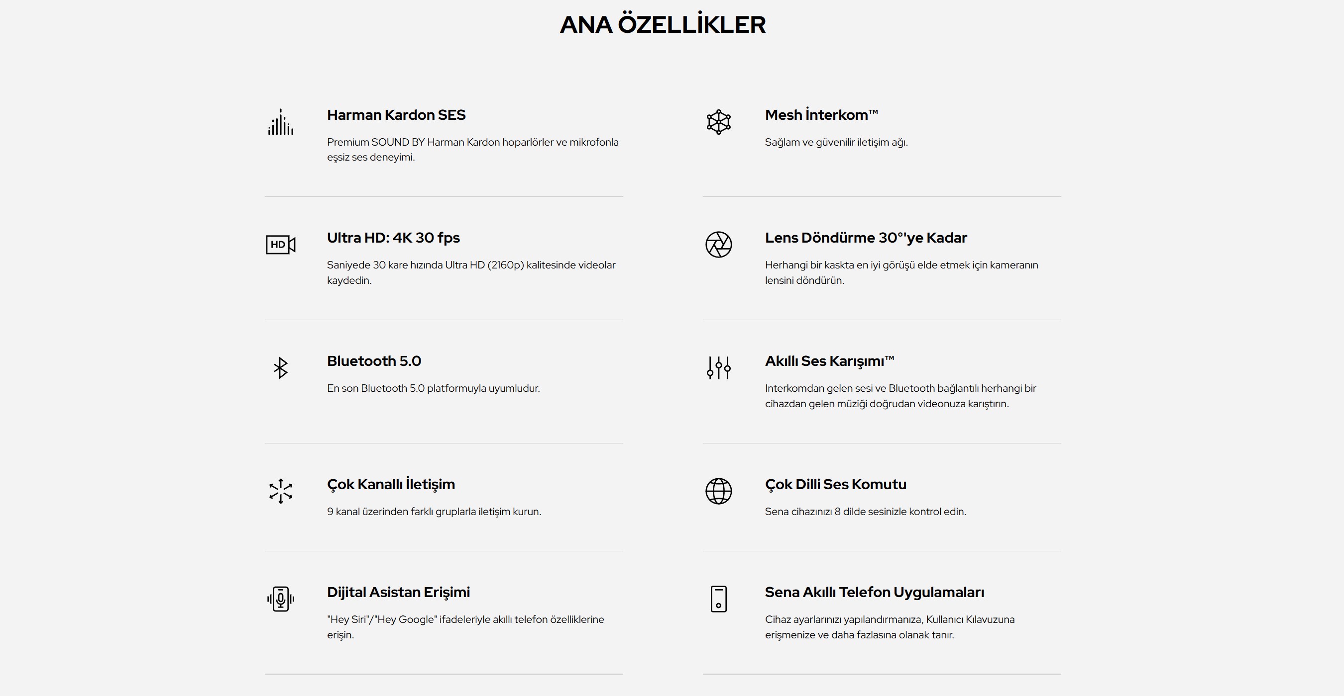 - Üniversal İnterkom: Sena marka olmayan Bluetooth interkomlarla bağlantı. (1 bağlantıya kadar)