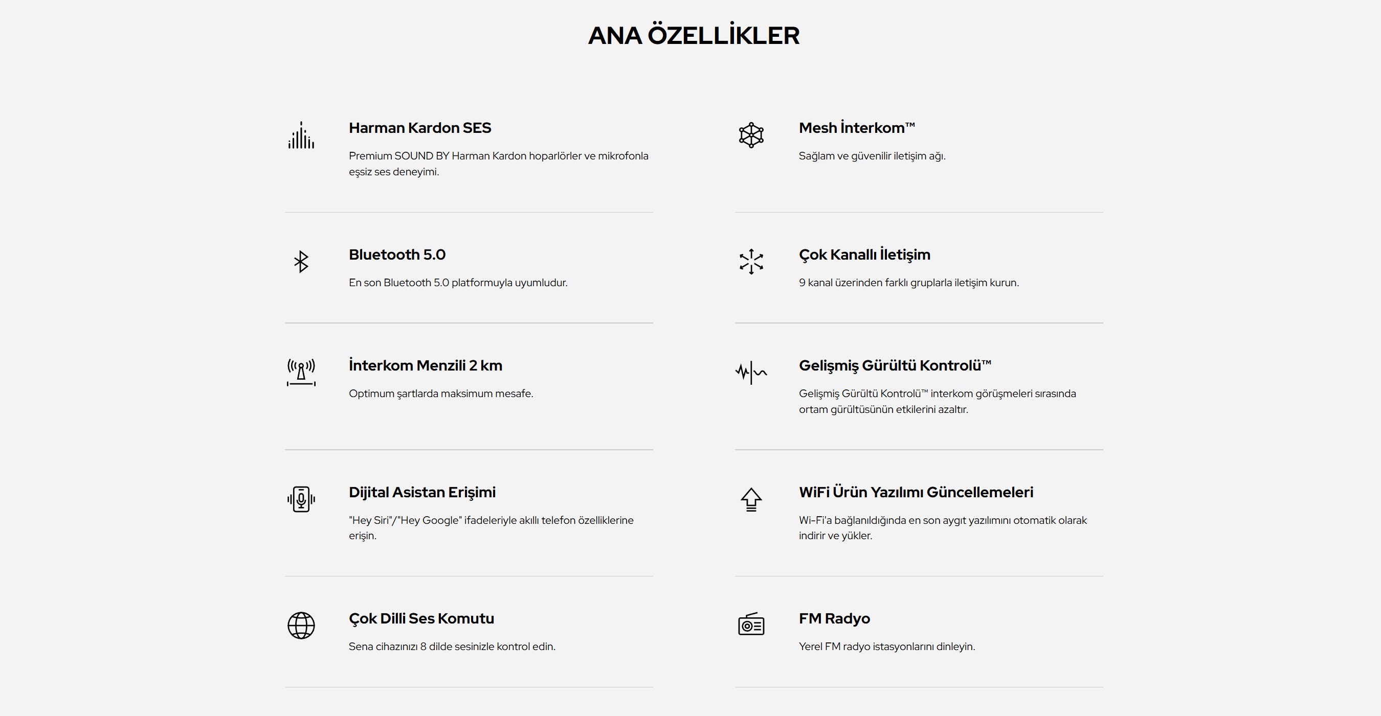 - Mesh Intercom™ Teknolojisi: Kolay, güçlü ve kesintisiz bağlantı, yüksek kullanıcı kapasitesi, daha geniş menzil, veri hızı ve güvenilirliği, ses netliği.