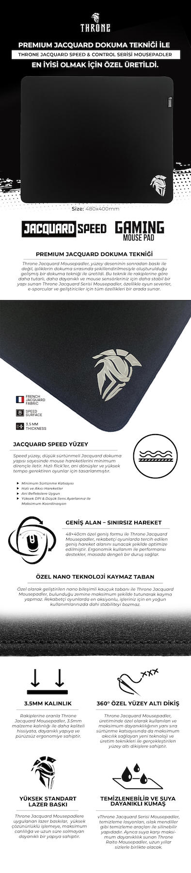 Throne Jacquard Speed 48x40cm Özel Üretim Fransız Jacquard Speed Kumaş - 3.5mm Kalınlık - Nano-Tech Yüzey Altı Dikiş - Kaydırmaz Zemin Premium Mousepad - 48x40 cm boyutlarındaki bu mousepad, geniş çalışma alanı sunarak fare hareketlerinizi rahatça yapmanızı sağlar.; - 3.5mm kalınlığı ile konforlu bir kullanım deneyimi sunar ve bilek desteği gerektirmeyen kullanıcılar için idealdir.; - Dikişli kenar tasarımı sayesinde dayanıklılığı artırılmış ve uzun ömürlü bir kullanım vaat eder.; - RGB aydınlatma özelliği bulunmamasına rağmen, siyah renk seçeneği ile şık ve sade bir görünüm sunar.; - Kaydırmaz yüzeyi ile masa üzerinde sabit kalır, oyun ve çalışma sırasında kesintisiz bir deneyim sağlar.; - İthalatçı garantisi altında olup, 2 yıl boyunca güvenle kullanabilirsiniz.; - Nemli bir bezle kolayca temizlenebilir yapısı sayesinde hijyenik bir kullanım imkanı sunar.; - CN menşeili olup, CLAWS TEKNOLOJI YATIRIMLARI ITHALAT VE IHRACAT LIMITED SIRKETI tarafından üretilmiştir.; - Baskılı deseni ile estetik bir görünüm kazandırırken, kullanım talimatları ve uyarıları ile doğru kullanım konusunda bilgilendirme sağlar.