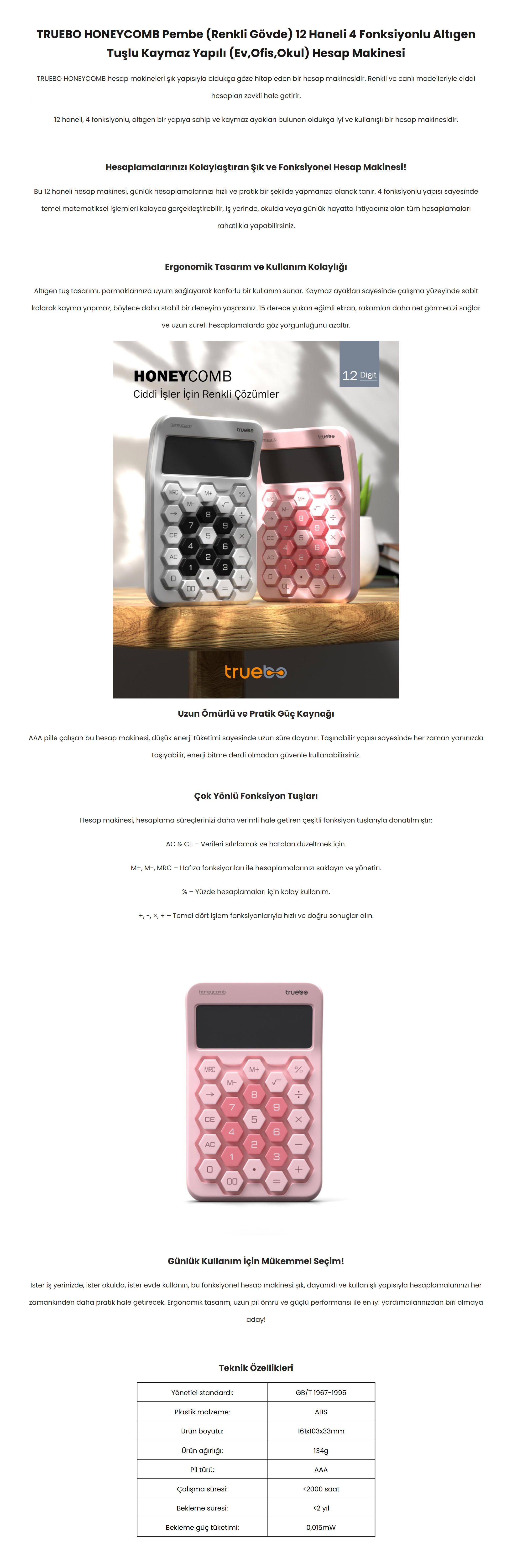 Truebo HoneyComb Pembe Renkli Hesap Makinesi