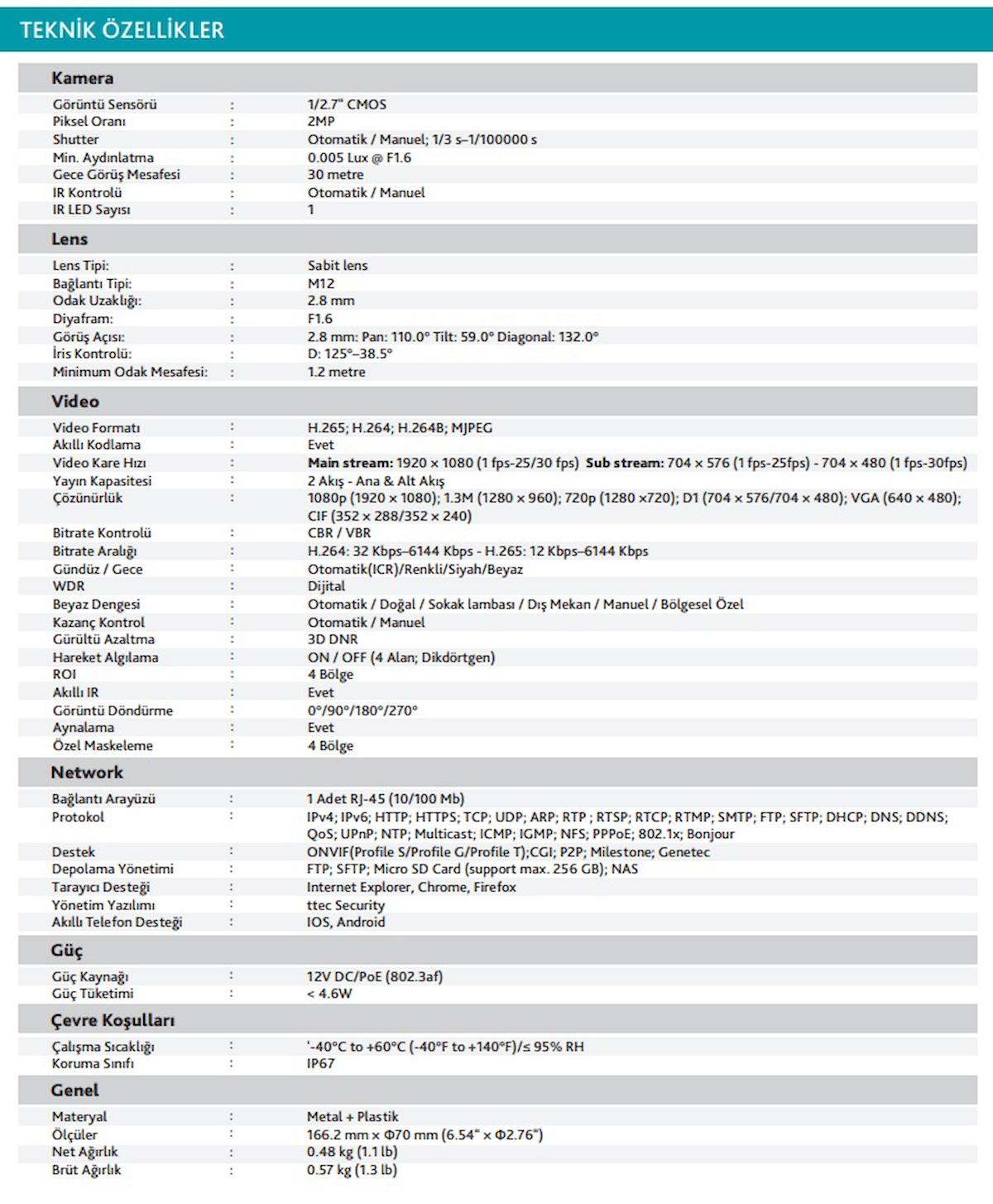TTEC IPBP-2030S/S 2 Mp 2.8 mm Sabit Lensli IR IP Bullet Kamera