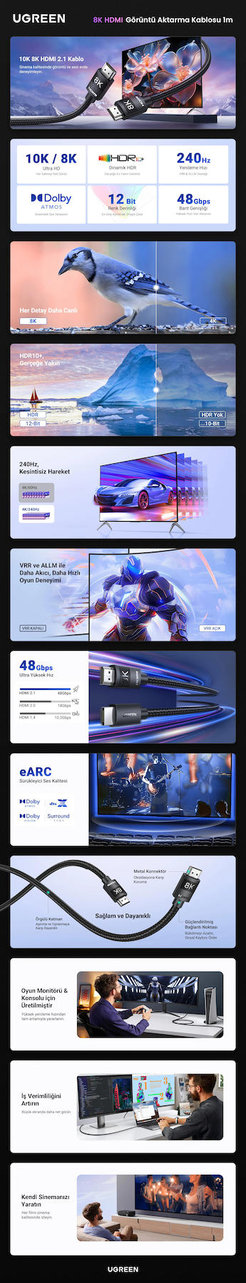 UGREEN 8K HDMI 2.1 Kablo 3D eARC HDCP 2.2/2.3, 1 Metre, 40178