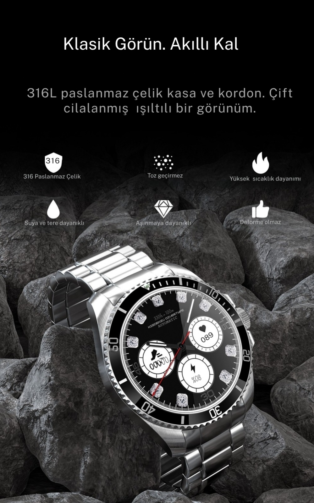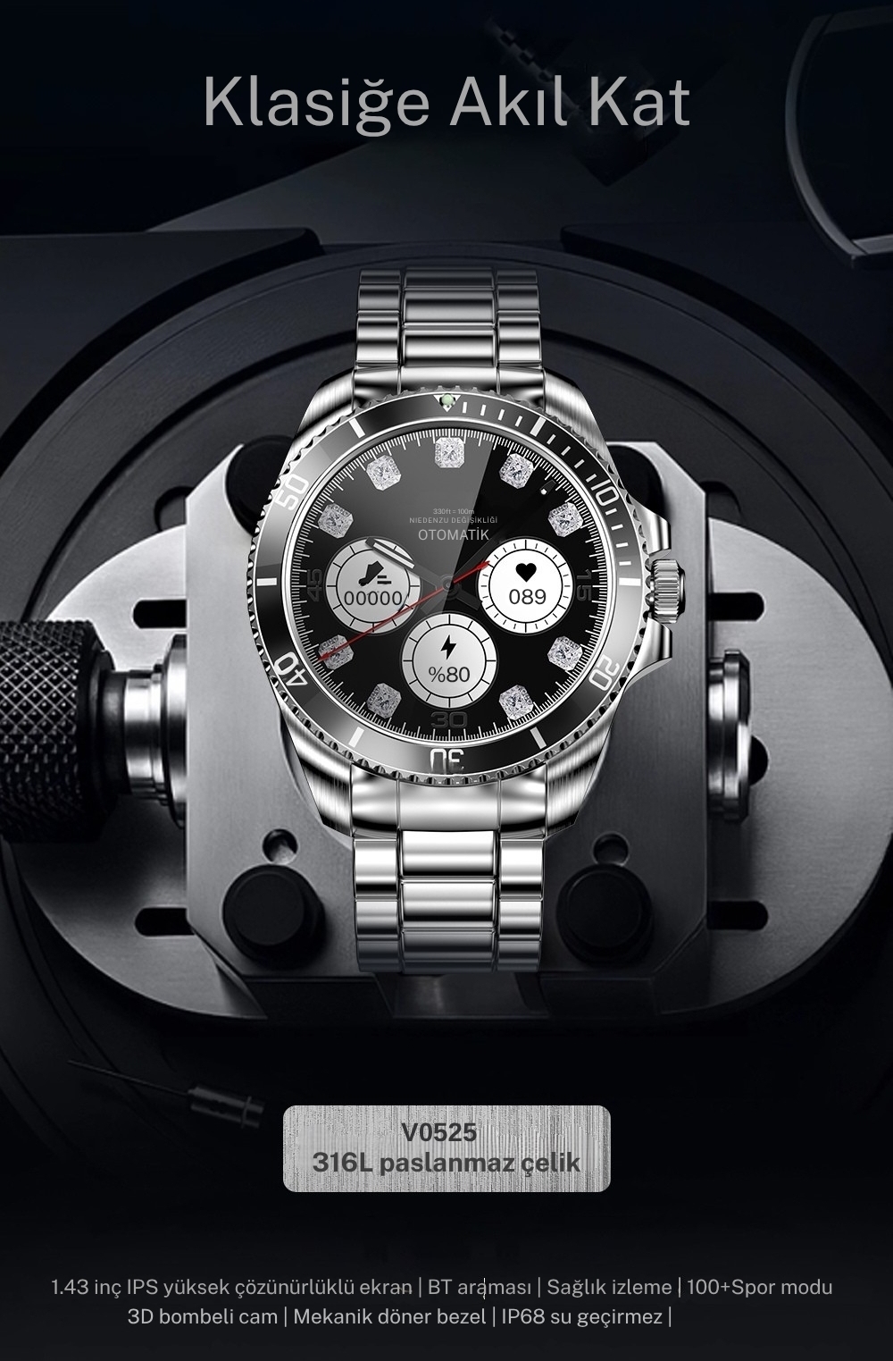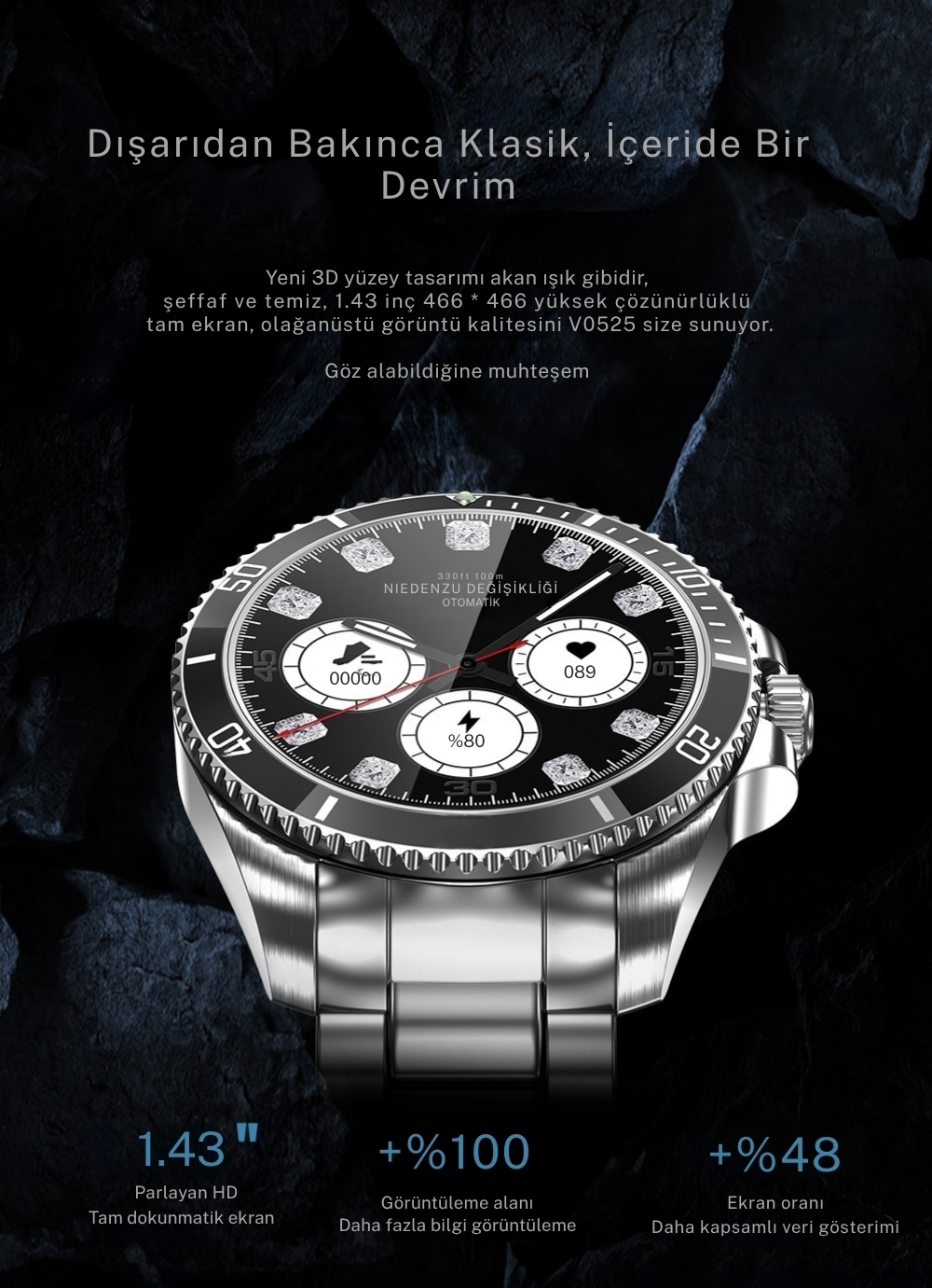3D Temperli Cam, 1,43 inç, TFT ekran, çözünürlük 466*466, VC30F (canlı nesne algılama işlevi / elden düşme algılama / gerçek zamanlı kalp atış hızı), gerçek zamanlı pusula, arka plan görevleri, 100’den fazla sağlık egzersizi, sektördeki tek 3D dışbükey cam, mekanik döner bezel, çoklu spor modu, başucu lambası modu, saat yüzünü özelleştirme, hava durumu, saat, zaman, alarm, uzaktan kamera kontrolü, rahatsız etmeyin, telefonu bulma, kronometre, telefon görüşmesi bildirimi, sms bildirimleri + sosyal medya bildirimleri SMS, IP68, 5~7 gün normal kullanım, 10~15 gün bekleme, Bluetooth 5.3+Bluetooth 3.0