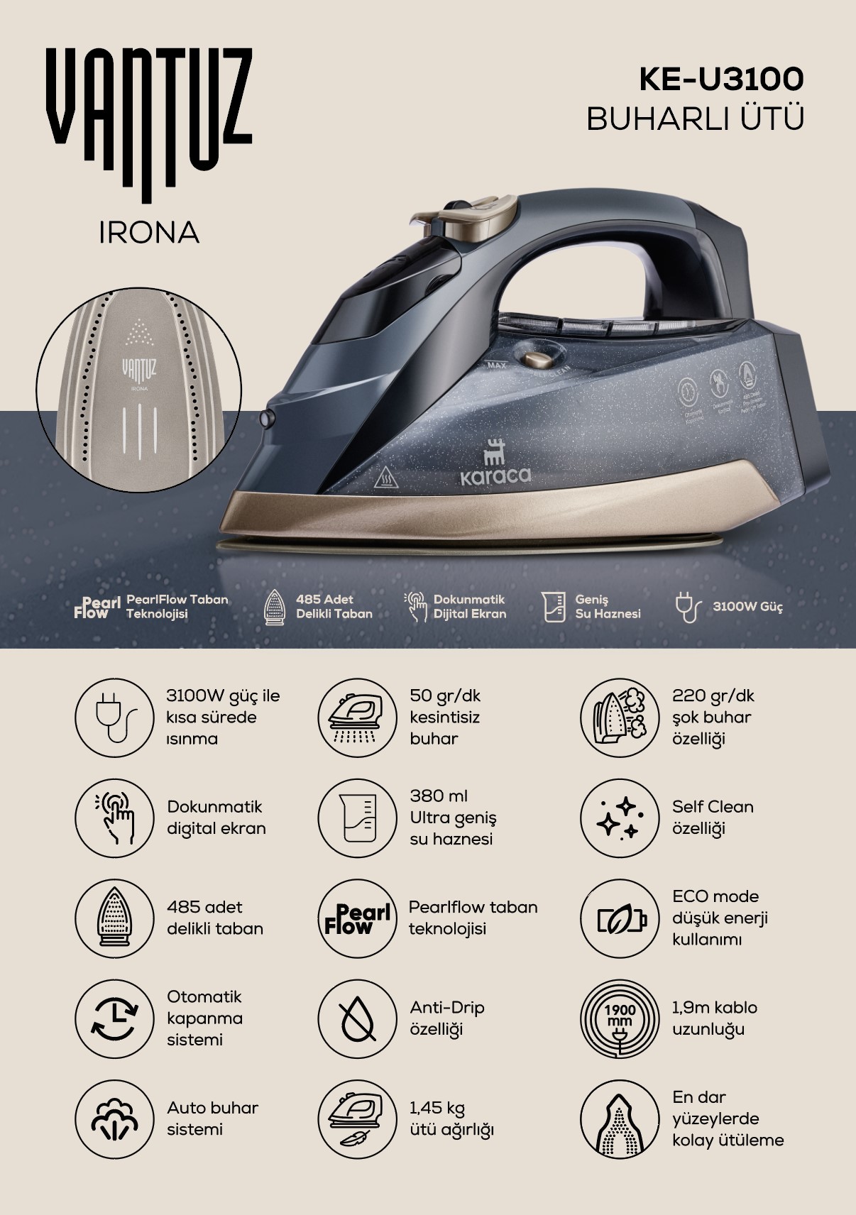 485 delikli pearl taban özelliği ile, tüm deliklerden eşit miktarda çıkan buhar giysilerinizle daha fazla noktada temas eder ve böylelikle tek seferde hızlı ve kolay ütüleme sağlar.
