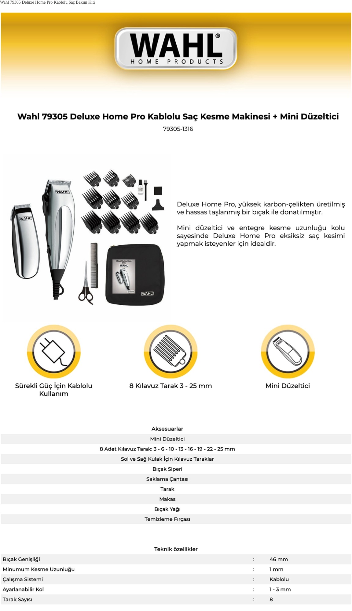- Wahl 79305 deluxe home pro kablolu saç bakım kiti 79305-1316 teknik özellikler