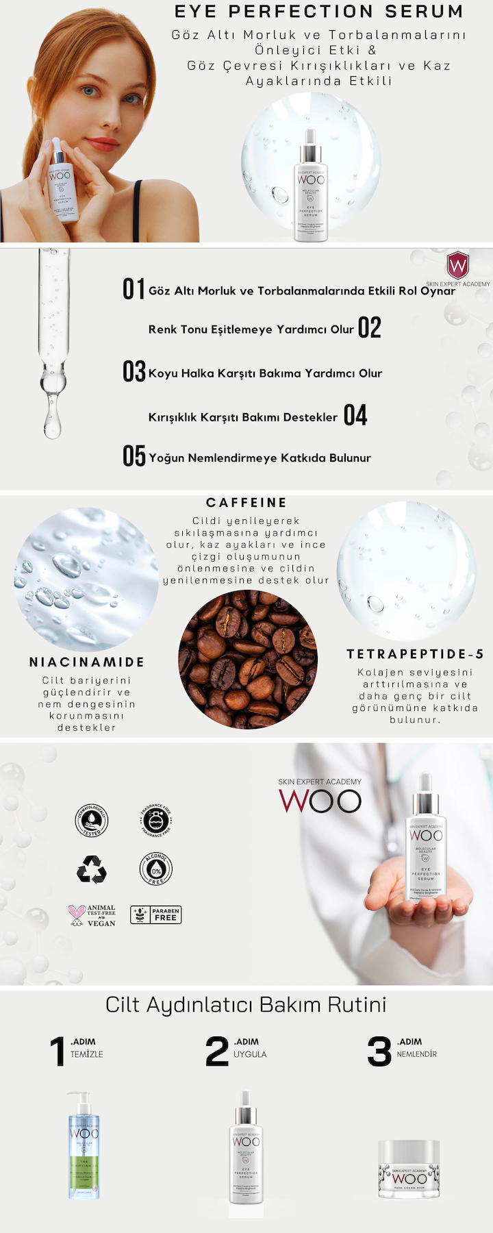 Göz Çevresi Bakım Serumu, zenginleştirilmiş içeriği ile göz çevrenizdeki renk tonu eşitsizliğini düzenler, nemlendirir ve dinlenmiş bir görünüm kazanmasına yardımcı olur. İçerdiği Kafein & Niasinamid & Tetrapeptide-5 ile göz çevresinde canlı ve sağlıklı bir görünüm sağlanmasına yardımcı olur. Tüm cilt tipleri için uygundur.