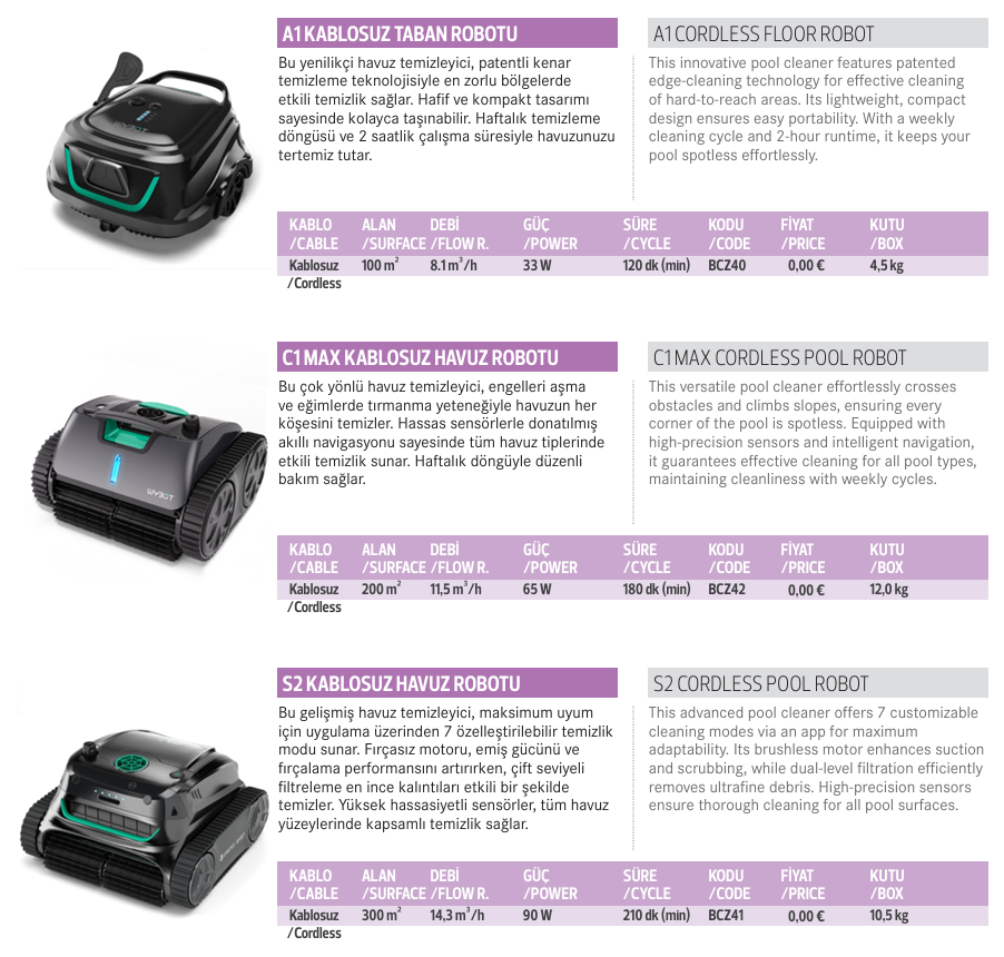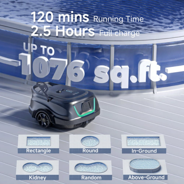 Bu yenilikçi havuz temizleyici, patentli kenar temizleme teknolojisiyle en zorlu bölgelerde etkili temizlik sağlar. Hafif ve kompakt tasarımı sayesinde kolayca taşınabilir. Haftalık temizleme döngüsü ve 2 saatlik çalışma süresiyle havuzunuzu tertemiz tutar.