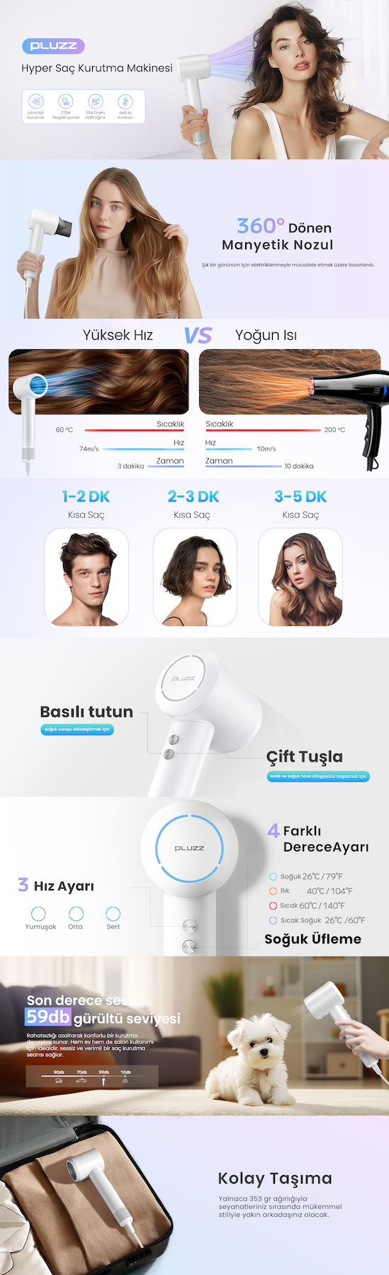 Pluzz X116 Se Mini Profesyonel İyonlu Saç Kurutma ve Fön Makinesi Ultra Sessiz ve Hızlı Kurutma ( Difüzör - Dar Başlık - Askı Aparatı)