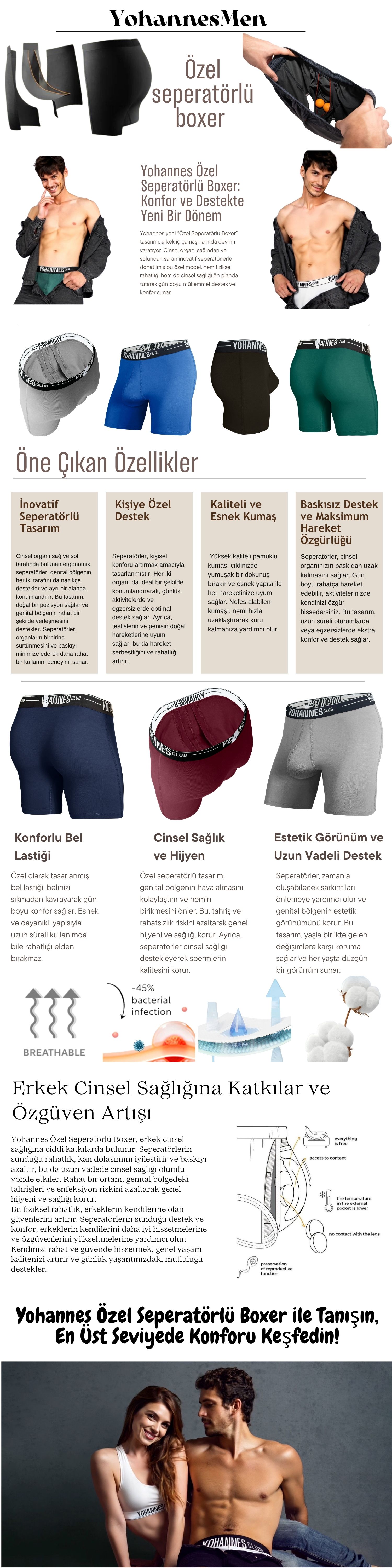 Modern erkekler için geliştirilen Yohannes Özel Seperatörlü Boxer, yalnızca iç giyim değil; vücudu anlayan, destekleyen ve koruyan bir inovasyondur. Genital bölgeyi sağ ve sol yandan saran ergonomik seperatörleriyle, baskıyı ortadan kaldırır, sürtünmeyi engeller ve cinsel sağlığı destekleyen ideal bir yaşam alanı sunar.